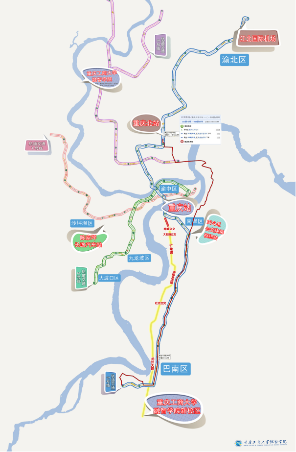 1.渝鲁大道——黄花园大桥——长江大桥——四公里——学府大道——渝南大道——鱼胡路口——融智学院