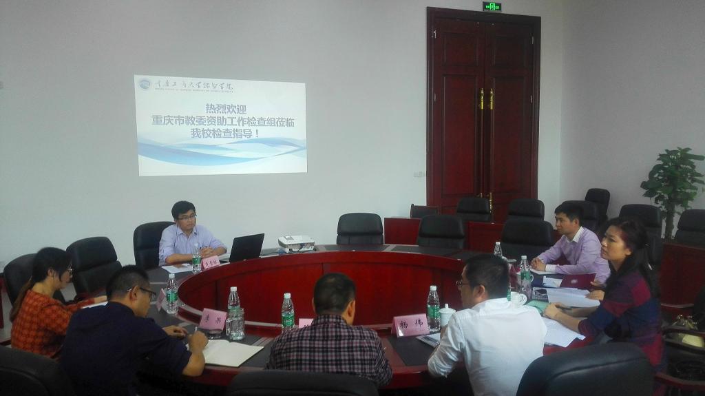 通讯员 张洪果)10月19日14:00,市教委资助工作检查组专家杨伟、陈卓、刘莉老师莅临我校,就我校资助工作进行指导。我校党委副书记陈龙国、院长助理兼学生处处长李果、财务处处长陈娅琳、学生处副处长兼团委书记李刚及学生资助管理中心副主任范雪林出席资助工作汇报会。