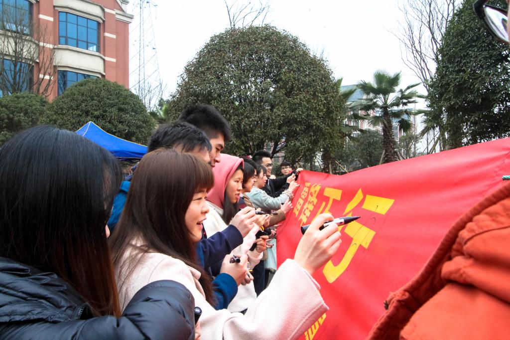 “学习雷锋好榜样,忠于革命忠于党”,伴随着浑厚的歌声,团委老师引用一句雷锋经典语录:“人的生命是有限的,可是,为人民服务是无限的”,宣布本次活动正式开始。随后,雷锋志愿者们豪情万丈的宣誓声响彻融智上空,相信他们定会如誓词中所说,不计报酬,服务社会,践行志愿精神,传播先进文化,为建设团结互助,平等友爱的美好融智贡献力量。仪式最后,雷锋志愿者们在印有“三月 融智与雷锋同行”字样的横幅上郑重签下了自己的姓名,与雷锋同行,与奉献的青春同行。