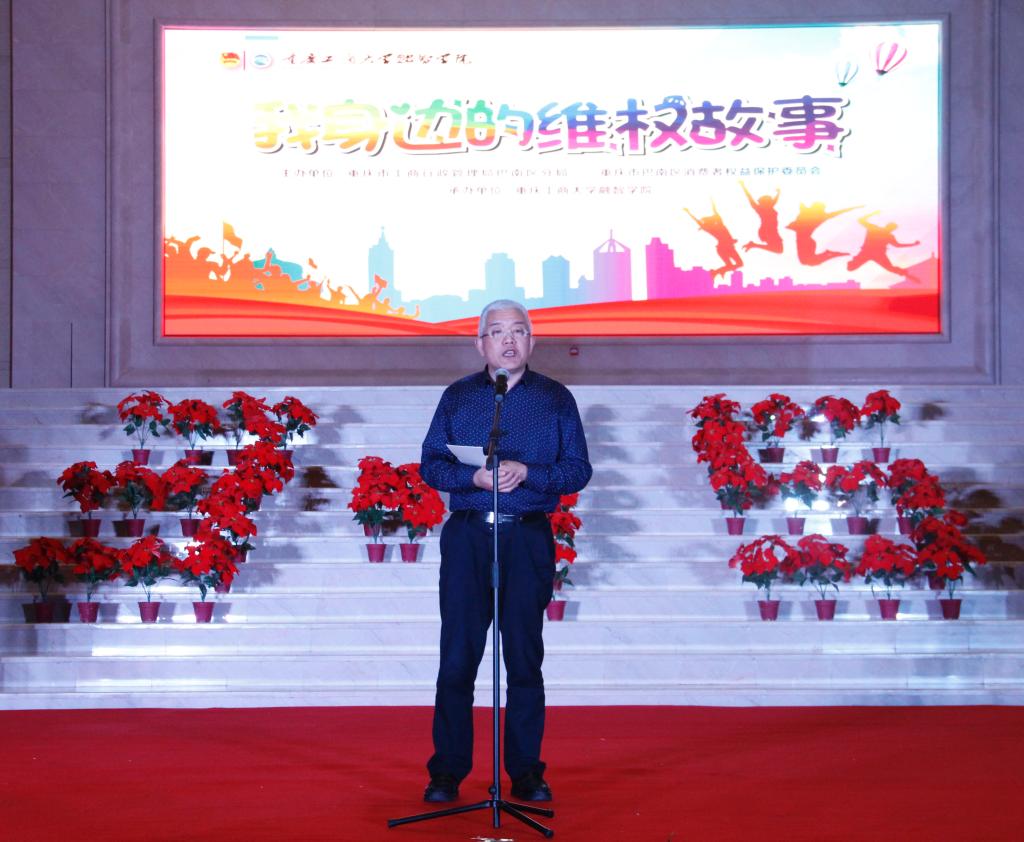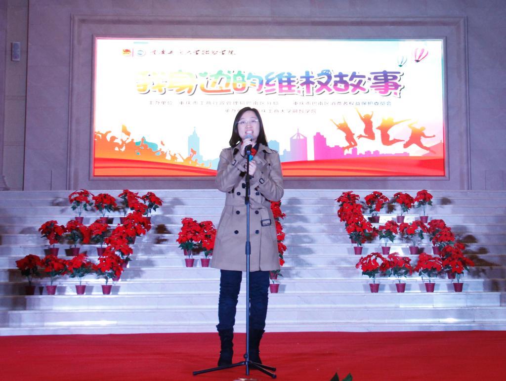 为响应“3.15维权日”,提高同学们的维权意识,树立正确的消费观念,由重庆市工商管理局巴南区分局主办,共青团重庆工商大学融智学院委员会承办的“我身边的维权故事”演讲比赛于3月28日晚上19:00在教学楼二楼大厅举行。重庆市巴南区政协副主席李伟、重庆市工商局巴南区分局副局长、区消委会常务副会长郭春雷、重庆市工商局巴南区分局副局长、区消委会副会长邓卫以及我校党委陈龙国副书记受邀出席本次比赛;同时,我们有幸邀请到重庆市消费者权益保护委员会秘书长徐京、重庆市工商局研究室主任季平、重庆市工商局市场消保处副处长谷丹、我校学生处处长唐川川老师以及经济学院副院长李红平老师担任本次演讲比赛的评委。