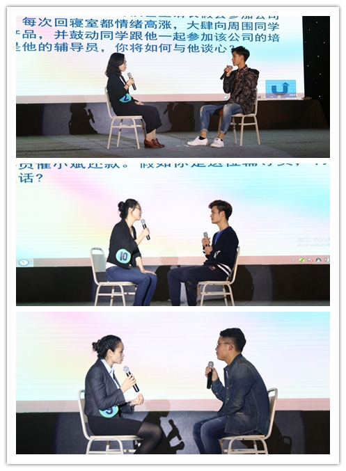在大赛进行的谈心谈话环节参赛老师现场抽取题目,通过情境再现的形式,与学生进行面对面交流。参赛老师们机敏灵活的处事能力,再搭配上学生们幽默积极、精彩绝伦如“影帝影后”一般的表演配合,令现场笑声不断、前俯后仰,赢得了台下热烈的掌声。
