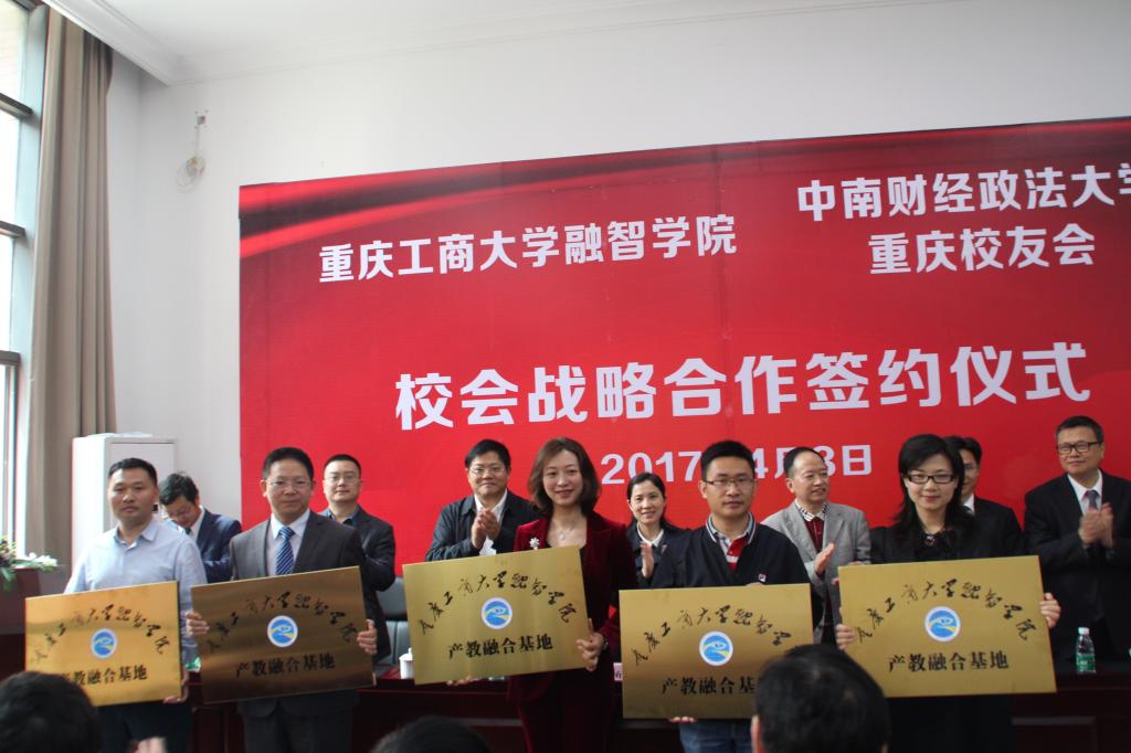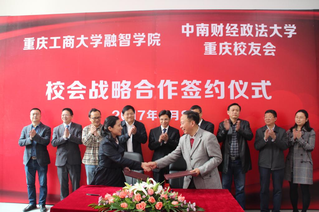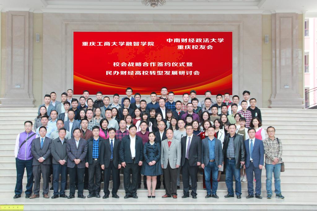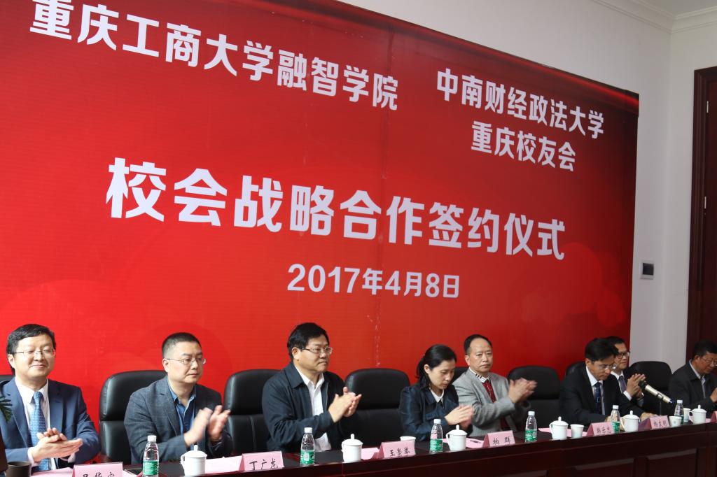 2017年4月8日,重庆工商大学融智学院与中南财经政法大学重庆校友会“校会战略合作签约仪式暨民办财经高校转型发展研讨会”在我校顺利召开。中南财经政法大学重庆校友会常务副会长韩乐忠先生、副会长兼秘书长杨友明先生、副秘书长蒋利众先生与近70名校友代表出席会议。新欧鹏教育集团专家委员会主任王崇举教授、重庆工商大学融智学院院长柏群、校党委书记丁广龙、副院长吴华安、副院长沈民、院长助理房朝君、教务处处长崔中山及各二级学院院长参会。
