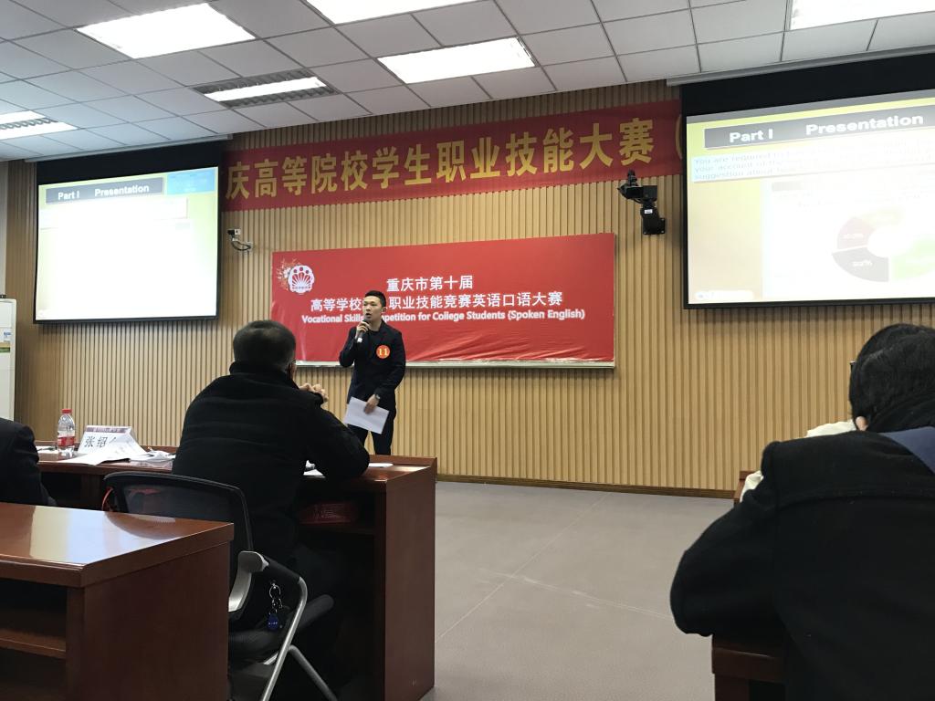 重庆市第十届高等院校学生职业技能竞赛英语口语大赛的评比模式分为两个部分,第一部分图表分析,第二部分是职场问答。本次比赛为我校学生提供了展示语言、沟通、思维能力的平台,也为教师提供推进教学改革、完善教学方法的机遇。