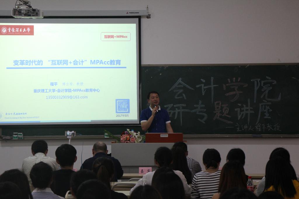 为了让会计学院的学生更加了解变革时代下的会计工作发展情况,让有考研志向的学生明确考研目标,5月17日下午18点30分,会计学院在教学楼312教室举办了以“变革时代的互联网+会计MPAcc教育”为主题的考研专题讲座,重庆理工大学程平教授应邀前来讲学,会计学院百余名学生的聆听了本次讲座。
