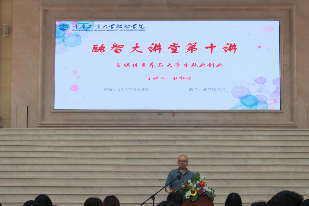 2017年5月25日,融智大讲堂第十讲“自媒体素养与大学生就业创业”在教学楼二楼大厅开讲。新浪重庆总编辑赵郁松先生应邀担任主讲嘉宾。