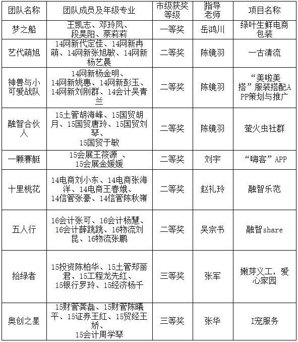 第五届电子商务三创赛市级赛我校获得2个二等奖、1个三等奖,我校获得重庆赛区优秀组织奖;第六届获得市级1个二等奖、1个三等奖;今年,第七届,我校获得重庆市1个一等奖、6个二等奖、2个三等奖!这些成绩离不开我校各部门和领导支持,离不开学生们和老师们的努力!此次比赛培养了更多融智学院大学生的创新、创意及创业热情,相信在以后的电子商务三创赛和在未来的创新创业中,我校学生能更加突破自我,再创人生辉煌!
