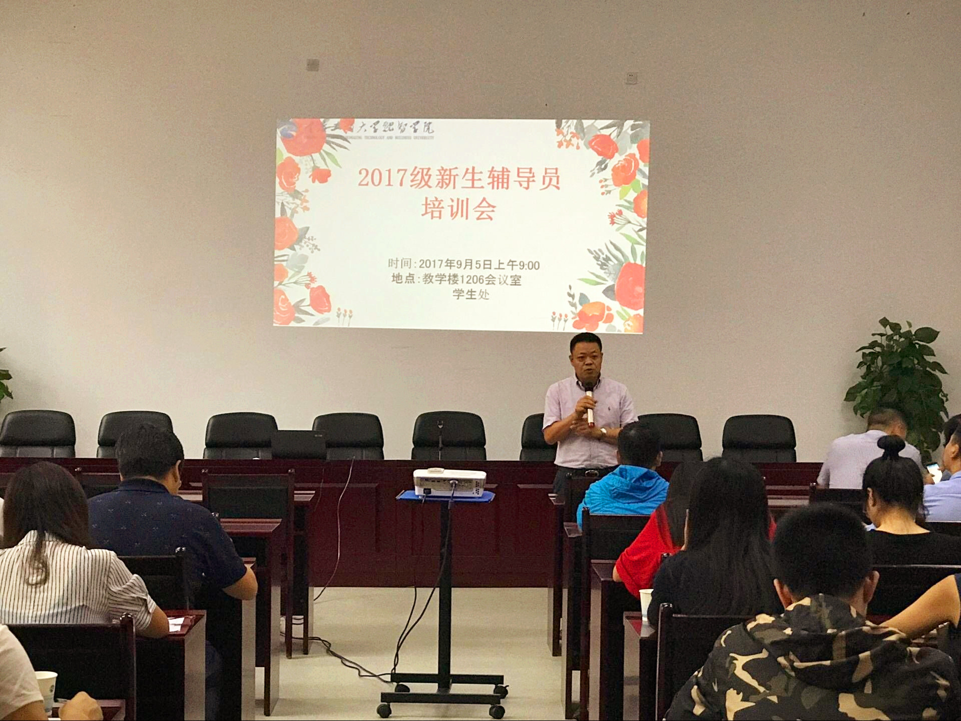 为迎接新生入校,更好的适应大学生活,我校学生会于9月5日上午9:00在教学楼1206会议室举行了2017级新生辅导员培训会,出席本次培训会的有我校党委副书记陈龙国、学生处处长唐川川、学生处副处长李刚、保卫处副处长欧英前、各学院党总支副书记以及各学院2017级专兼职辅导员。本次会议由唐川川老师主持。