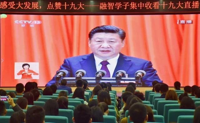 浏览中国飞速发展的短片,伴随着振奋人心的国歌奏响,大会就此拉开序幕。全体参加观看直播的师生们,通过屏幕,认真观看和聆听习近平总书记代表第十八届中央委员会,所作《不忘初心、牢记使命,高举中国特色社会主义伟大旗帜,决胜全面建成小康社会,夺取新时代中国特色社会主义伟大胜利,为实现中华民族伟大复兴的中国梦不懈奋斗》的报告。大家认真聆听,一丝不苟,并用最热烈的掌声,为党和国家取得的成就点赞。诚然,在场的每一位都为自己是中国人民而深感骄傲自豪。