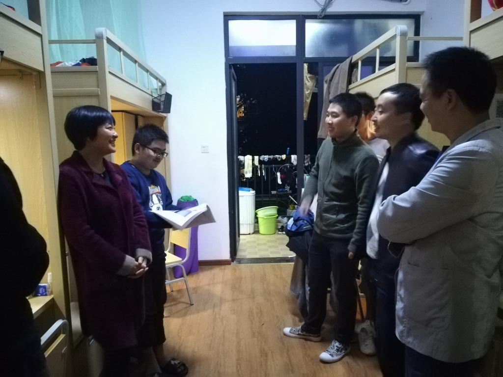 党的十九大的召开使整个校园都沉浸在喜迎十九大的氛围当中,陈副书记带领巡查组的老师,走访了多个学生寝室,了解学生十九大的学习状况,鼓励学生多了解国家大事,了解党的方针政策,以大局观念规划自己的学习。