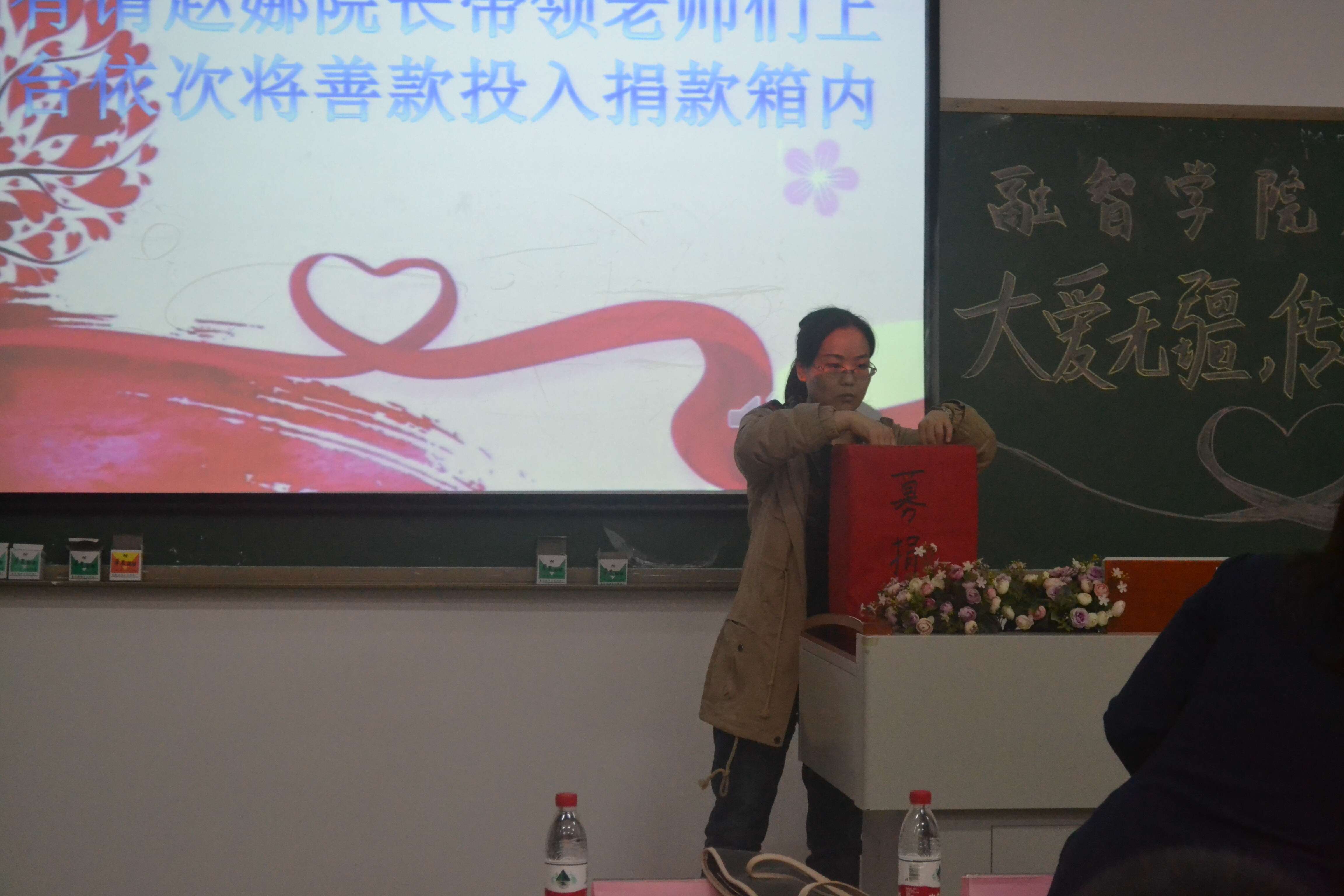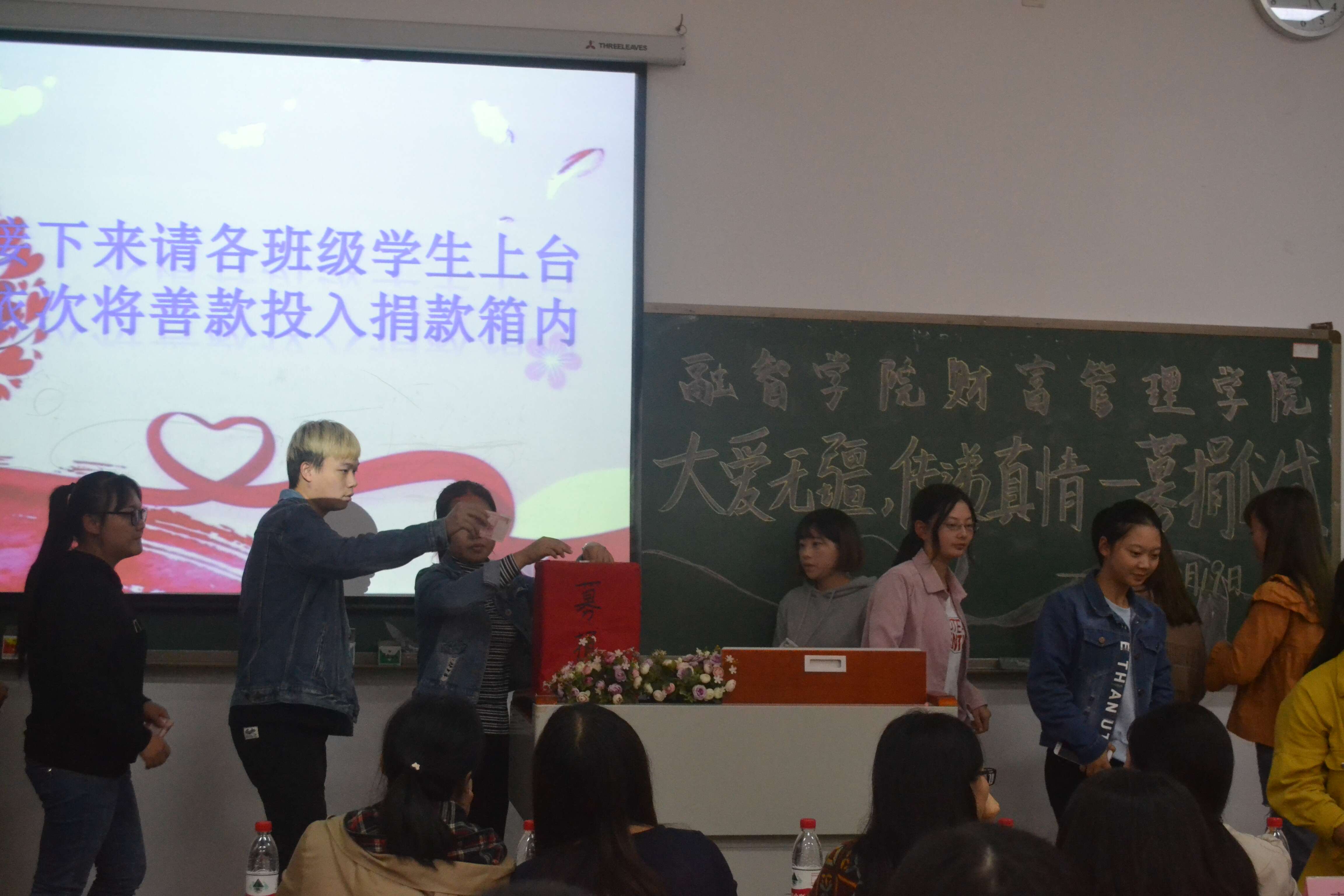 财富管理学院团总支学生会主席团代表和党服代表上台捐款。到场的各位同学也积极响应学院号召,依次上台捐出自己的一点爱心帮助贺同学,希望他能战胜病魔并渡过难关。