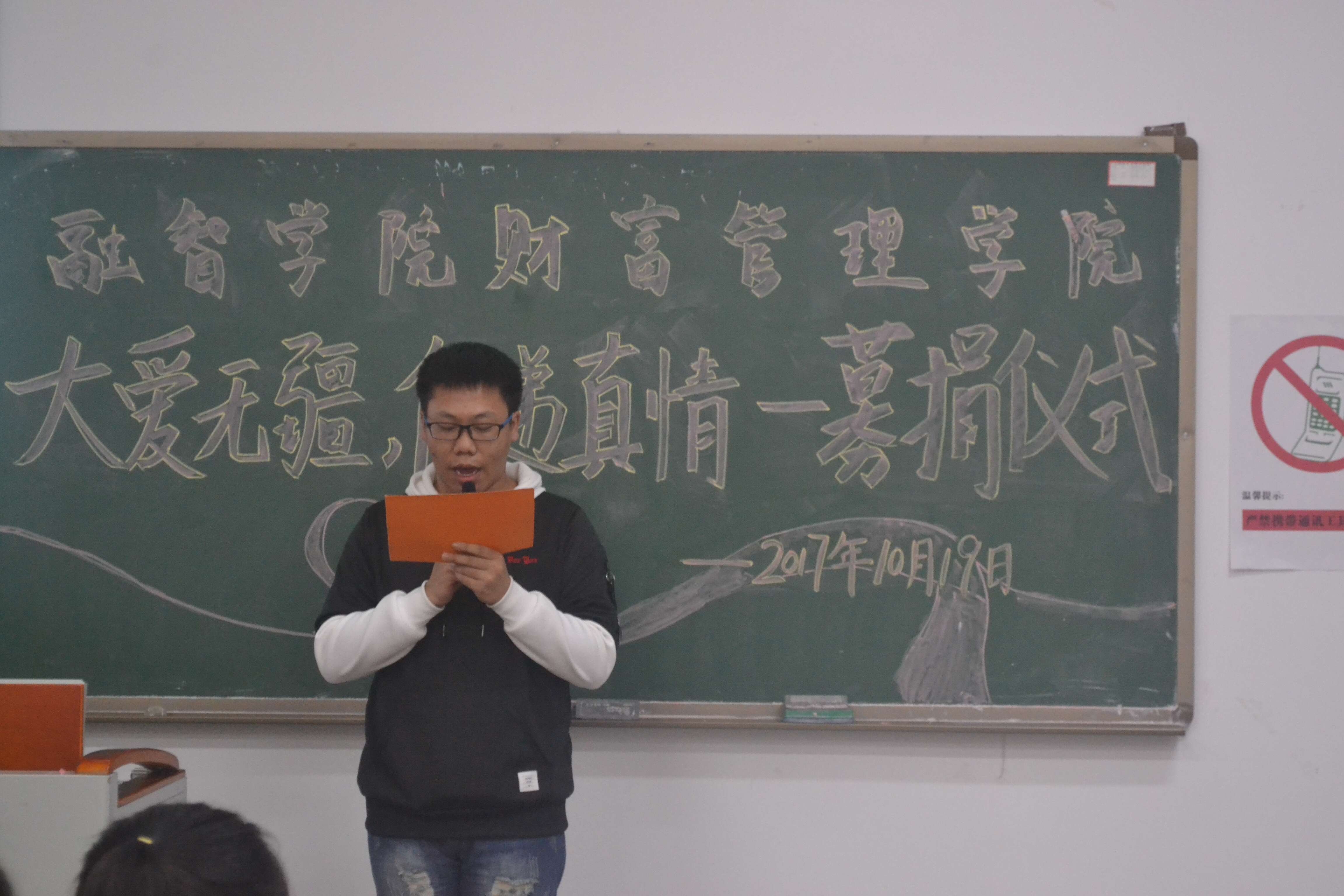 病魔无情,人间有爱。我校财富管理学院2016级财务管理四班的贺同学,于2017年10月17日被确诊患有脑部肿瘤。得知这一不幸消息后,财富管理学院积极开展系列关爱活动,并于10月19日13点10分,在教学楼1520教室举办了以“大爱无疆,传递真情”为主题的募捐仪式。