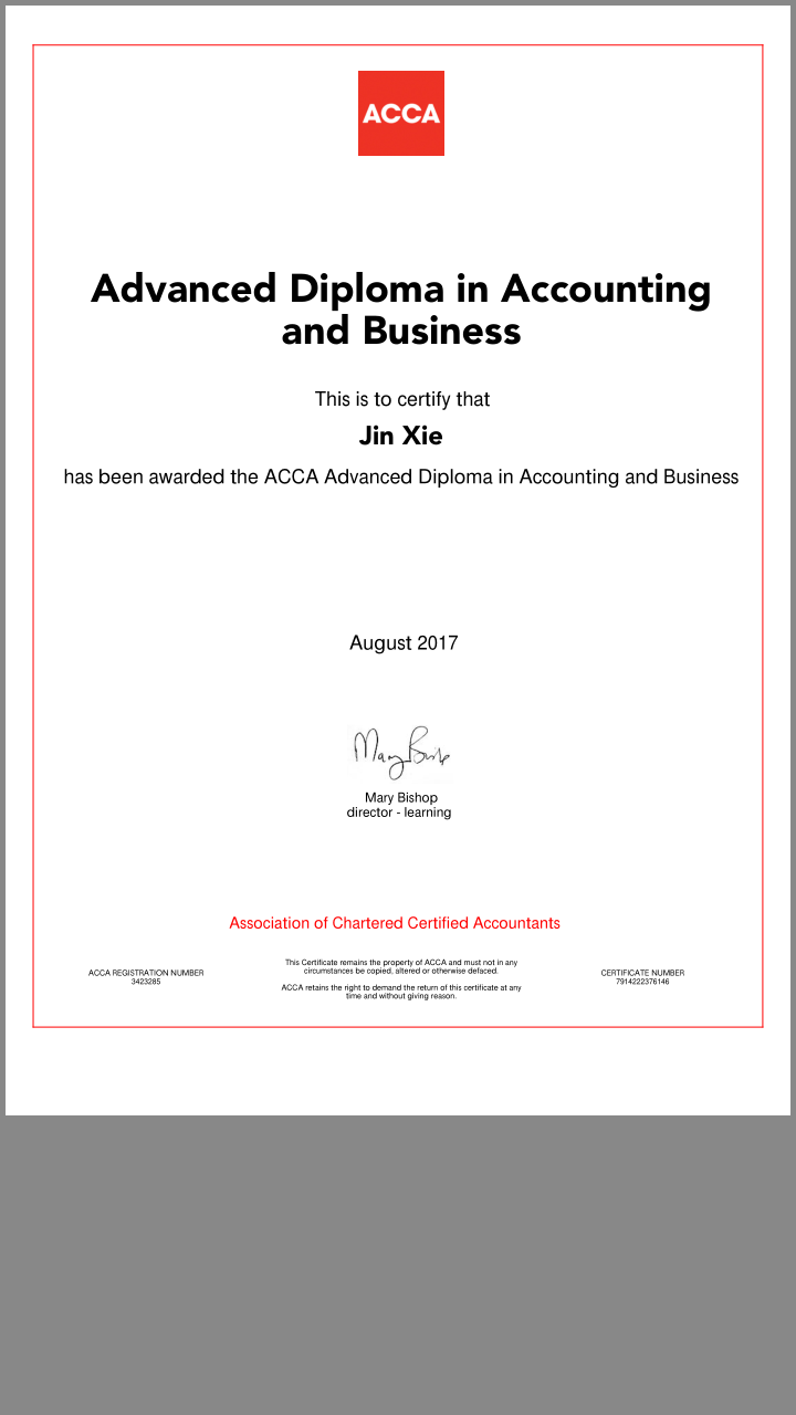 “起点不一样,但终点一样” 一直是谢瑾同学激励她自己的话。为此她是这样诠释:成功,需要大胆的假设,细心的求证。她说:“ACCA带给我的不仅仅是证书,带来更多的,是学习ACCA的这个过程。它让我学会了坚持,学会了一个人成长,习惯了每天都要学习。大三这一年将成为我人生中最难忘的一段岁月,因为在那一年,我没有辜负自己。选择了,再累也要坚持下去。当我每天晚上一个人踟蹰路上时,我想起的不是孤单与路长,而是波澜壮阔的海和天空中闪耀的星光。”