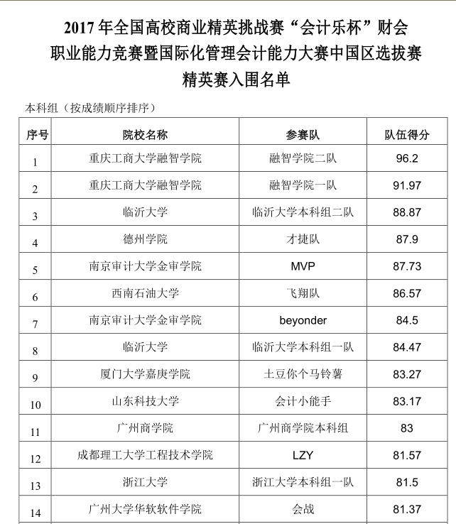 10月21日,2017 年全国高校商业精英挑战赛“会计乐杯”财会职业能力竞赛暨国际化管理会计能力大赛中国区选拔赛(本科组)启动,并于近日进行了全国总决赛。我校会计学院由韩佳佚老师带队、罗萍和王婧婧老师指导的两支队伍在全国总决赛中脱颖而出,分别以第一和第二名的好成绩获得全国一等奖和二等奖,成功晋级全国精英赛(精英赛冠军将免费参加美国管理会计师协会百年年会)。