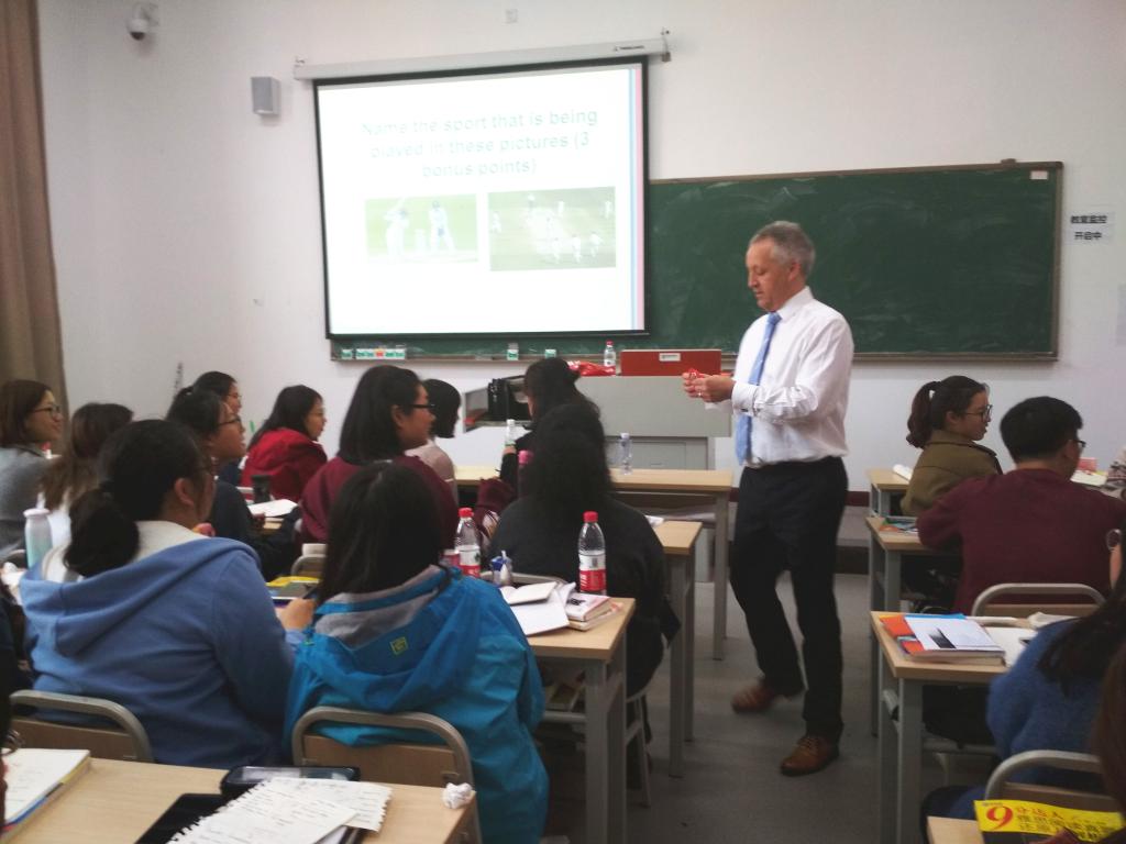 一开始,SeanHolmes教授的到来立即使课堂热闹起来。同学们对外教充满好奇的同时,更感慨于学校带给大家不可多得的“福利”。紧接着,Holmes教授向同学们介绍了布鲁内尔大学的历史和由来,以及其在全英国工程类专业里出类拔萃的地位。就英语口语交流方面,Holmes教授向同学们传授了如何在初次见面时给对方留下深刻印象的方式。在轻松愉快的氛围中,Holmes教授利用图片、视频、英语知识小测验等方式向同学们展示了英国全貌,让同学们领略了英伦文化和风土人情,提高了同学们学习英语的热情和兴趣。课上的交流互动瞬间拉近了师生距离,更让同学们在不同文化和思想的碰撞中感受中英思维的差异。