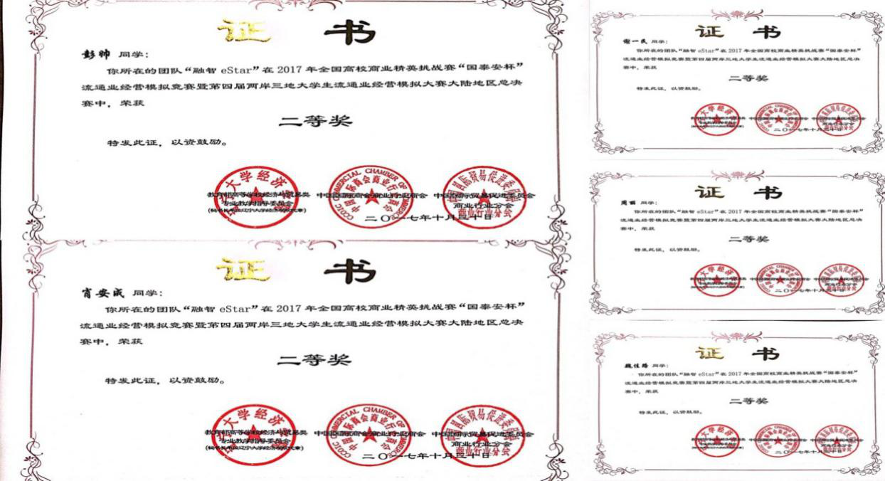 本次比赛从报名准备到大陆总决赛结束,历时6个月三个阶段:知识赛、大陆地区预选赛、大陆地区总决赛,经济学院共有12名学生参与知识赛,12名学生共3个团队参与大陆地区预选赛,最后2个团队挤进总决赛。来自15级贸经专业彭帅、魏佳路等同学的“融智eStar队”喜获全国二等奖;来自15级贸经专业黄丹琳、陶彦均等同学的“融智RZmax队”喜获全国三等奖。据悉,全国各高校参与此次比赛共计249个团队,这也是我校第一次参与流通业创新实践类大赛并获奖。