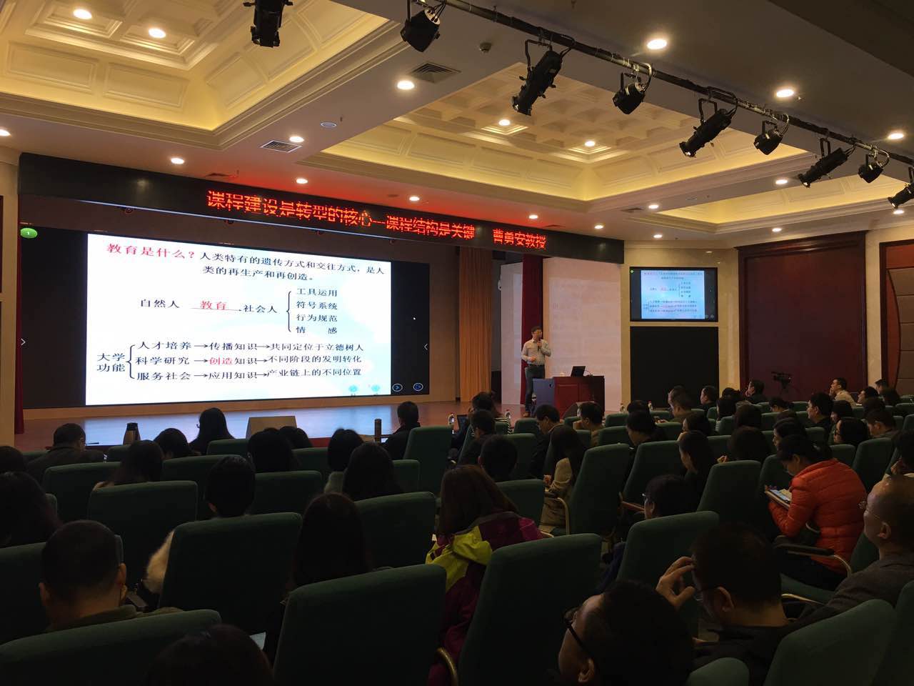 下午,曹勇安教授的讲座专题是《课程管理是转型的保障—创建学习型高校》。曹教授紧接着上午讲授的课程结构建设内容,进一步深入讲解课程管理的重要性。曹教授结合齐齐哈尔工程学院建设发展的实际案例,对人才培养目标、课程建设原则、如何转型发展等方面提出了自己独到的见解。并结合自身办学的实践经验,具体讲授了齐齐哈尔工程学院的具体课程管理与设计,分别具体到大学四年每一年每个阶段的校内学习与校外实习任务。在演讲过程中曹教授结合自身的丰富办学实践经验,鲜明生动的实践案例,阐述了当代高校办学的发展观与经营观,整个演讲现场气氛活跃,掌声如潮。