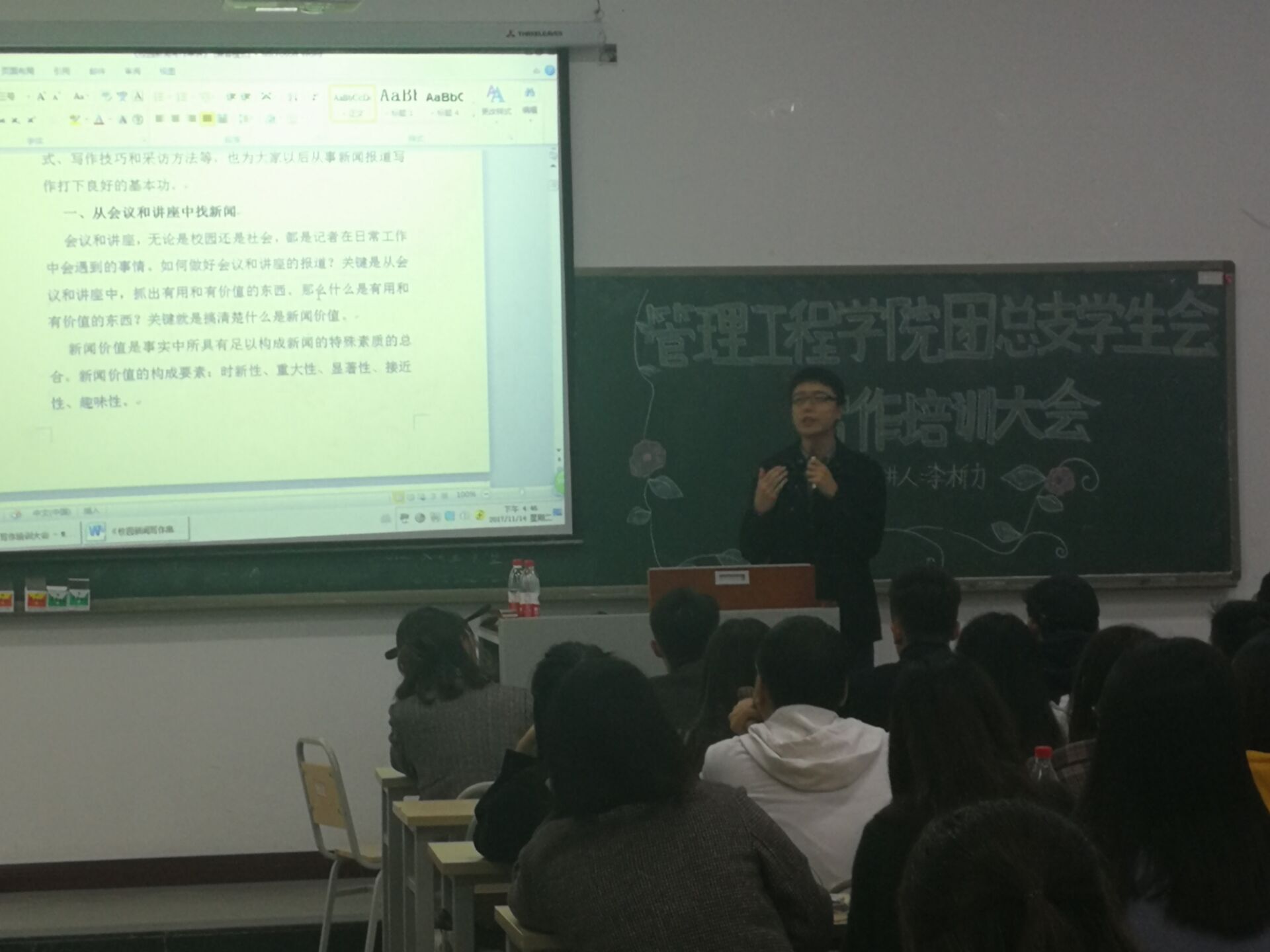 "作为一名新闻工作者,从采写编评,都应该抓准其中的新闻价值。"14日下午,以"如何更好地进行新闻的宣传创作"为主题的团干培训在教学楼1414教室展开。本次邀请来了李析力副教授为同学们进行新闻稿写作方面的培训。