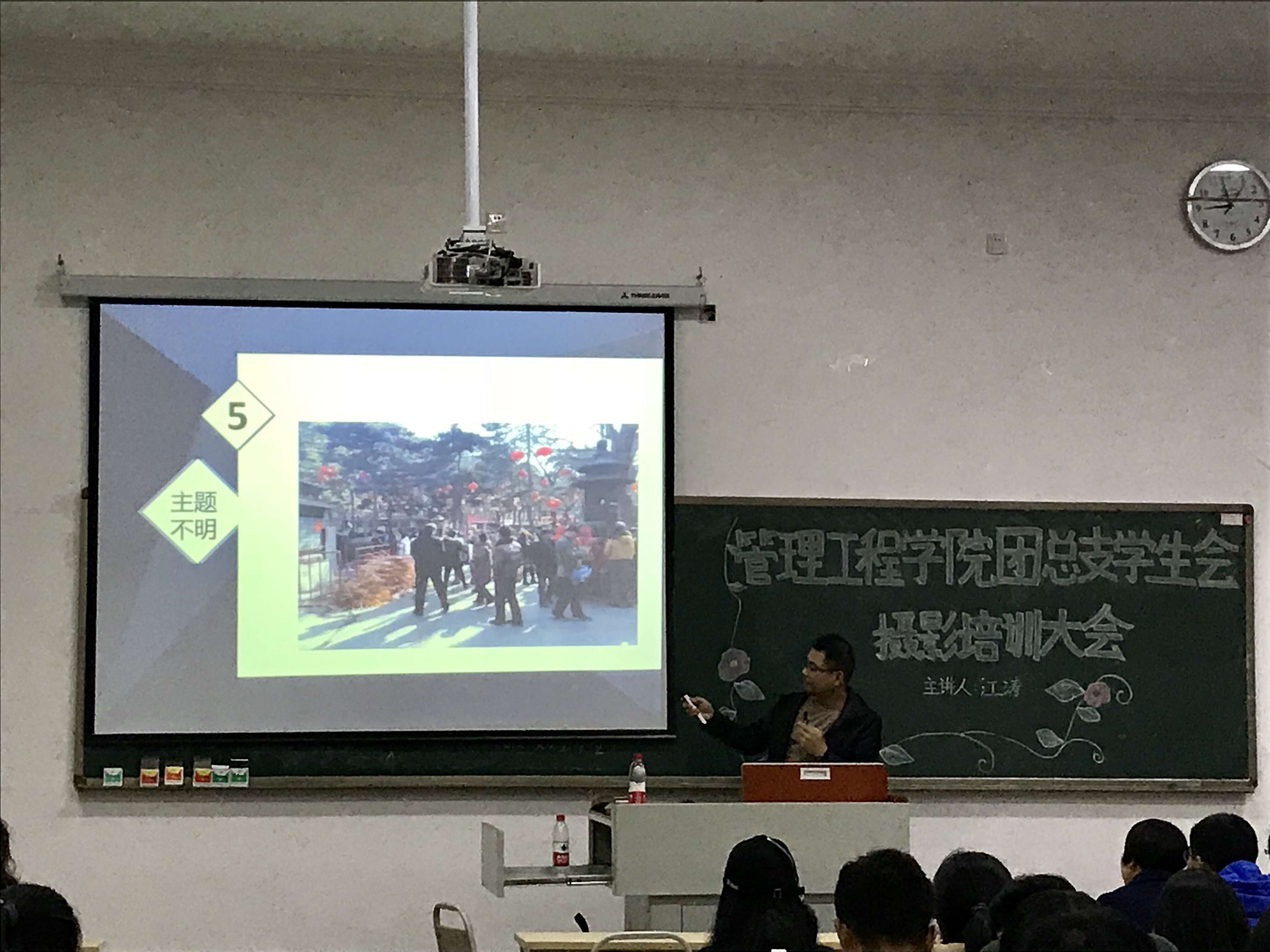 诚然,新闻的创作十分重要,但在读图时代和新媒体迅猛发展的今天,新闻摄影的特殊性和重要性同样突出。为此,14日晚,同样在1414教室,由管理工程学院组织开展的“团干培训之摄像培训”,以一组鲜活生动的摄影作品吸引了大家的目光,作品的主人便是本次活动主讲人江涛老师。拥有二十多年摄影爱好的江老师,从摄影记者的职业操守到拍摄过程中的实际操作方法,以简洁易懂的语言和具有典型性的照片给大家上了精彩有趣的一课。一句"让你的照片会说话"带领大家走进摄影的美学境界,体验通过图片传达情感的多元性,同学们纷纷表示受益匪浅。