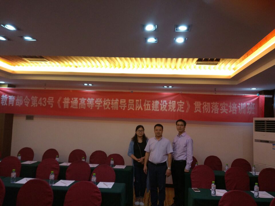 11月15—18日,在学校党委陈龙国副书记带领下,学生处唐川川处长、财富管理学院党总支莫险峰副书记一行三人,在海口参加了由中国高等教育研究会举办的“教育部令第43号《普通高等学校辅导员队伍建设规定》贯彻落实培训班”学习并顺利结业。