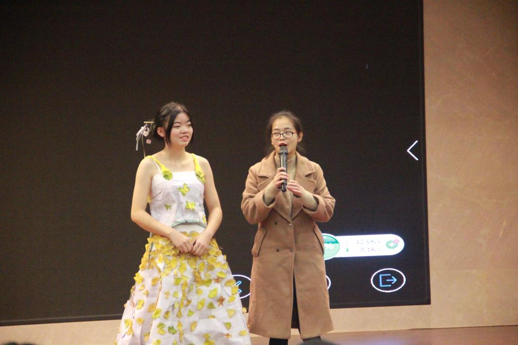 在比赛现场,各参赛队伍依次展示自己的作品,并对作品的设计理念、细节、主题进行详尽的解说。有利用围巾做出短款上衣的、有利用掉落的银杏叶和枫叶做出裙子的、有利用塑料袋做出长裙的……有的小组穿上自己动手做的魔术服装开展了一场幽默表演,有的小组穿着手工制作的魔幻衣进行了一段即兴走秀,还有沉浸于自制婚纱的同学遨游在想象的婚礼里……所有的作品都突出了本次活动的主题,以“废物利用”为出发点,以废旧的物品为主材料,意在向大家传达“低碳、环保”这一概念。这些用废物改造的衣裙穿在模特的身上,低调不失时尚。作品展示之后,由评委们打分,此次得分将决定队伍是否进入下一轮比赛。
