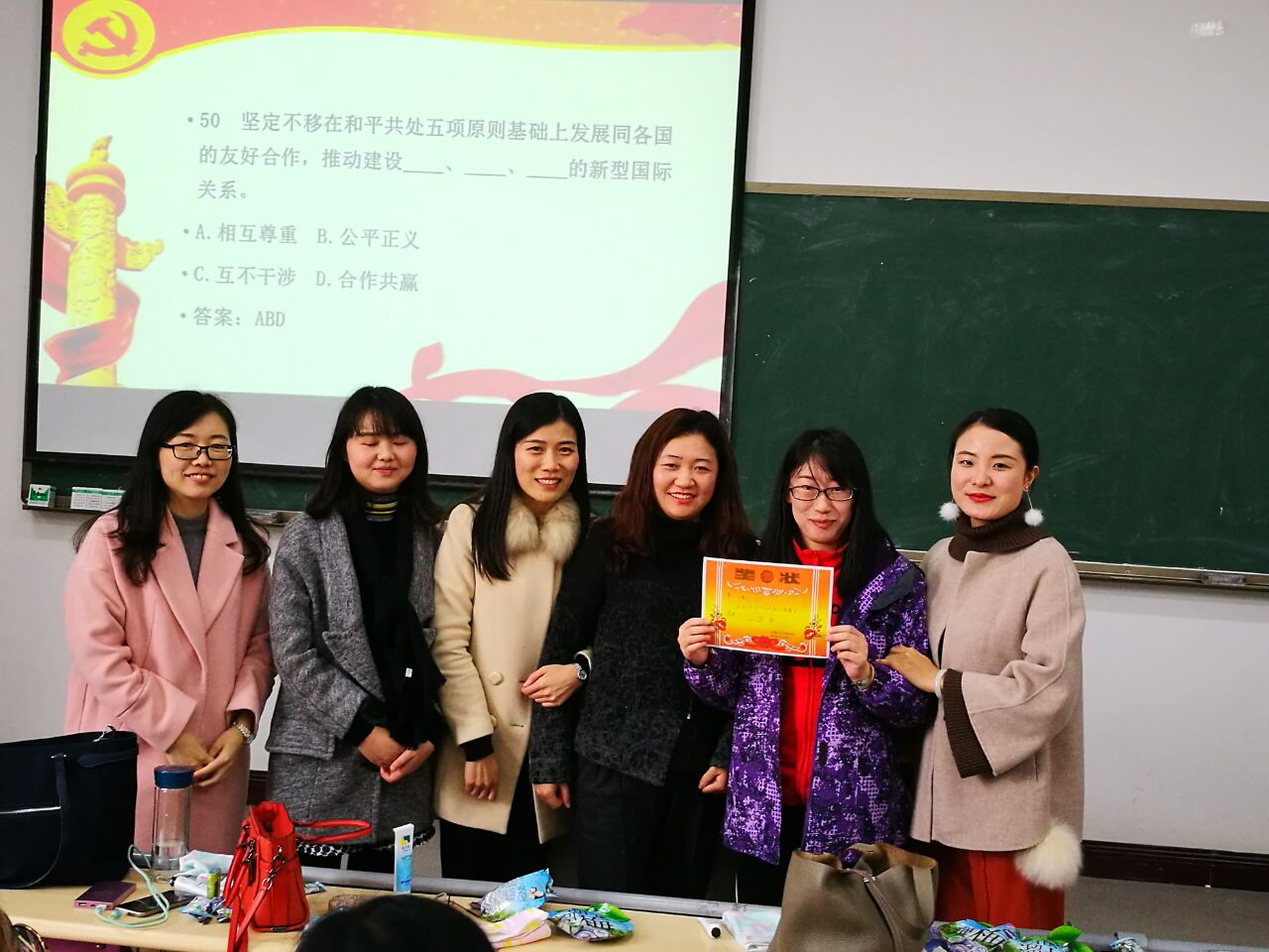 知识竞赛主要为抢答题,共计50题,其中35题为单选题,15题为多选题。教师党员分成三个小组,各小组抢答,答题速度快且正确者得分,实行个人奖励和小组奖励双重奖励的方式;比赛过程中,全体党员参与度高,充分地调动了大家的积极性。经过激烈的竞争角逐,最后第一小组以17分的优异成绩获得了比赛的第一名。