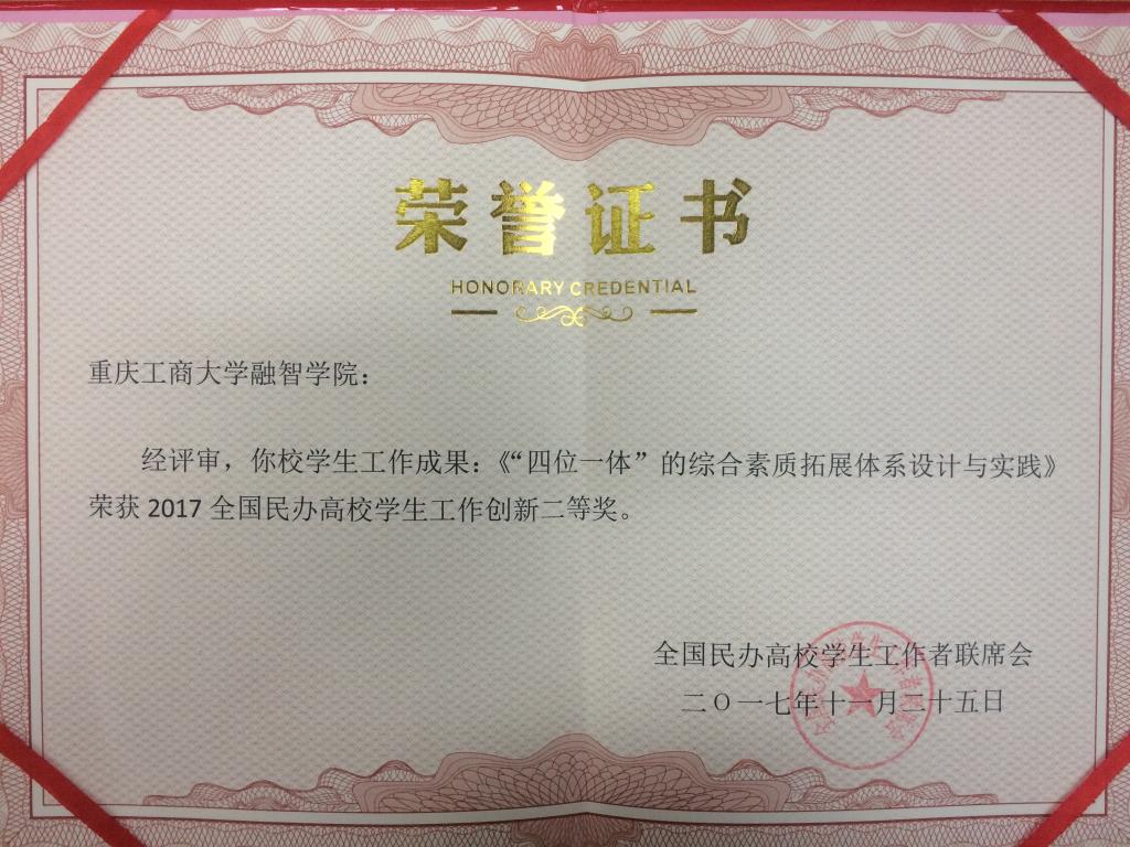 最后,大会进行了年度学生工作创新奖颁奖典礼。经各院校推荐,联席会组织专家评议,我校报送的学生工作创新成果作品《“四位一体”的综合素质拓展体系设计与实践》荣获全国民办高校学生工作创新成果二等奖。