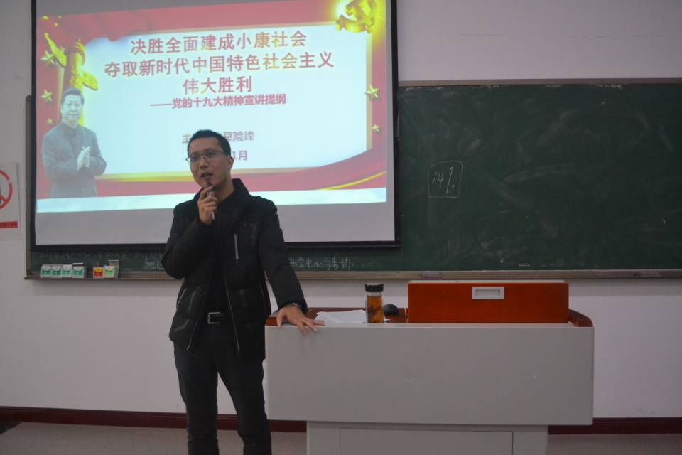 为了深入学习宣传贯彻党的十九大精神,在学校党委的安排与部署下,财富管理学院党总支分别于11月29日和30日的中午12:30—14:00,在教学楼1613教室召开了党的十九大精神宣讲会。本次宣讲会的主讲人是财富管理学院党总支副书记莫险峰,学院教职工及部分学生代表近两百人参加学习。