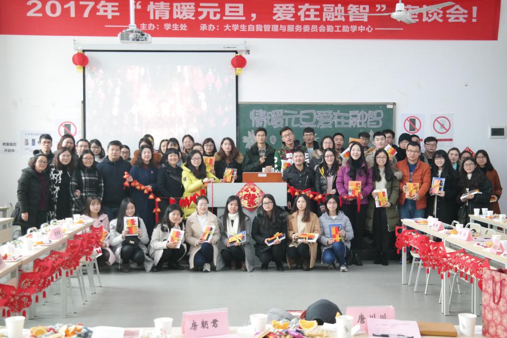 2017年12月22日中午,由我校学生处主办、大学生自我管理与服务委员会(以下简称“大自委”)勤工助学中心承办的“情暖元旦,爱在融智”座谈会于教学楼1414教室顺利进行。出席本次座谈会的嘉宾有:校长助理房朝君、学生处处长唐川川、会计学院党总支副书记姚转花、商务学院党总支副书记宋湘琴、财富管理学院党总支副书记莫险峰、管理工程学院党总支副书记高雪莲、信息工程学院党总支副书记叶远帆、物流工程学院党总支副书记李喆、学生处资助中心主任王玲艳,各学院资助专员以及我校受资助学生代表参加了此次座谈会。