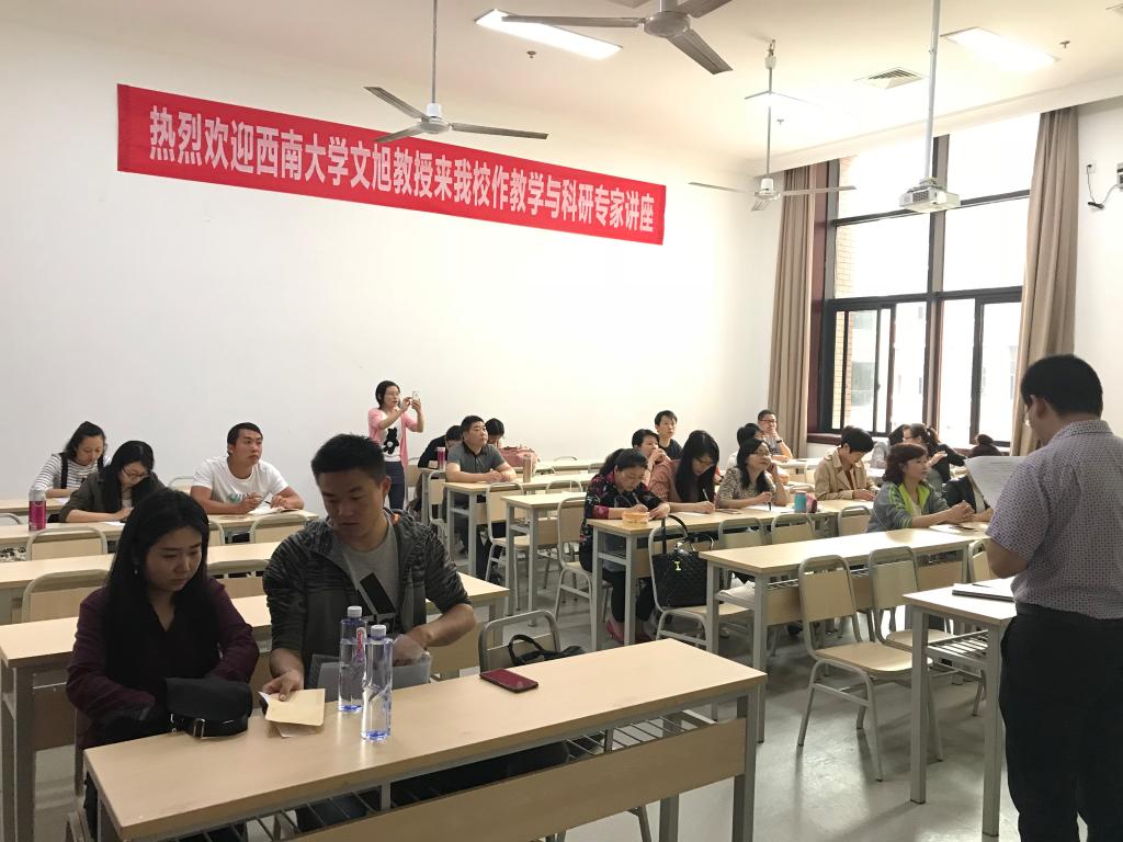 首先,文教授用诙谐简练的语言讲解了科学研究的主要目的、教师教学的培养目标。其次,围绕着如何写好学术论文这个主题,讲授了论文的写作思路,如何做研究、学术规范需要注意的问题,好的学术论文的特征,如何找到好的题目,专家和审稿人特别关注的地方,如何做文献综述和参考文献等问题。文教授把理论知识化繁为简、深入浅出,不但清晰的定位了何为“学术创新与学术规范”,并为如何撰写高质量的科研论文提出了很好的建议。讲座过程中,老师们都认真听,仔细记录,不时就讲座内容向文教授提问,互动交流非常活跃,气氛热烈。
