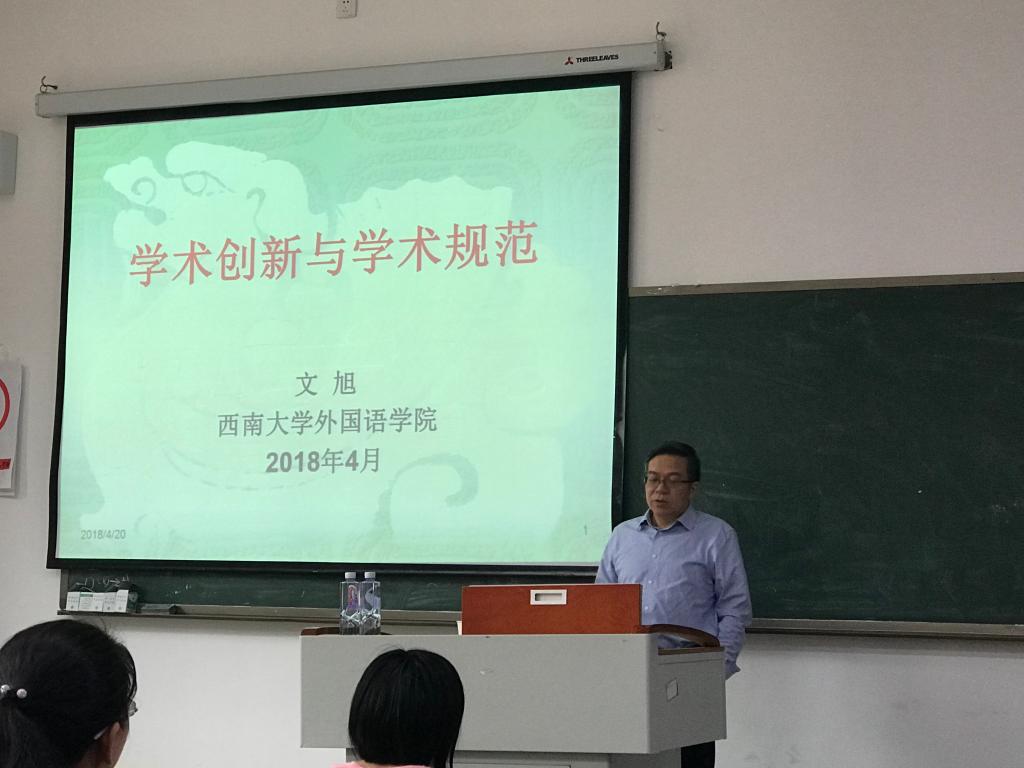 4月20日,为进一步提高教师的科研学术水平、提升教师的论文撰写能力,由基础课教学部和北京外语教学与研究出版社主办的“学术规范与学术创新”的专题讲座在教学楼1308教室顺利举行。此次讲座邀请了西南大学外国语学院院长、博士生导师、国务院政府特殊津贴获得者、重庆市学术带头人,西南大学学位评定委员会副主席文旭教授。基础部全体专职教师一起聆听了此次讲座,本次讲座由基础课教学部吕福起副主任主持。