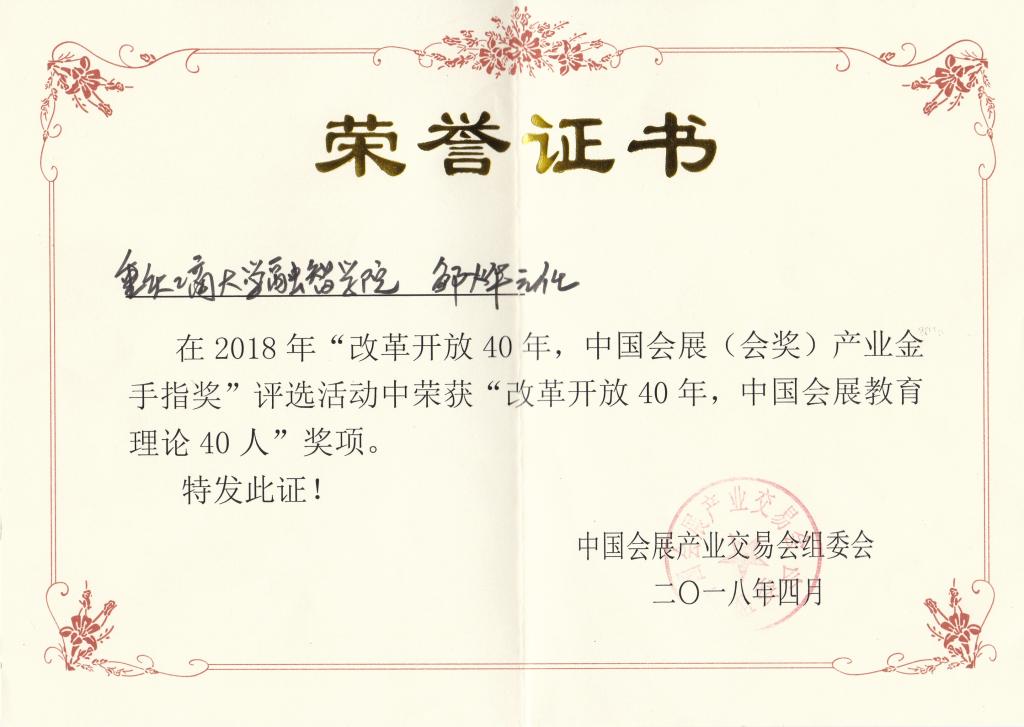 本届大会由中国主办者联盟、中国会展(会奖)产业交易会组委会共同主办,海口市会展局协办,以“主办让城市更美好,主办、主流、主宰”为宗旨,回顾了改革开放40年来,中国主办者走过的历程,形成的产业特征、收获的产业成果;展望了未来5到10年中国主办者发展的趋势与中国会展经济发展的互动与融合;讨论了中国当下的会展产业发展的新经济、新趋势、新发展,中国会展经济发展的新的机遇。中国会展财富论坛是我国会展行业领域最高层次的专业经济论坛,是行业的标志性峰会,“中国会展产业金手指奖"有着中国会展业年度“奥斯卡”美誉,是国内会展行业内最高荣誉。我校教师获奖标志着我校的会展专业在全国会展业界得到的肯定。