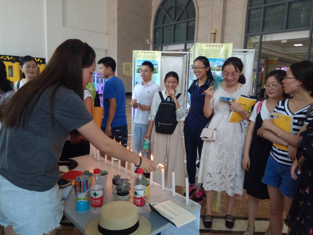 青春如诗,梦想如歌。炎热的夏天抵挡不住全校师生的热情,本次活动除了让学生了解国际项目、体验异域文化以外,还设有咨询处以及别有生趣的游戏板块,吸引着来来往往的同学们驻足。他们可浏览国际项目海报、海外姊妹学校赠予的纪念品,观看游学精彩视频,了解我校与境外高校签约的时间及合作项目。值得一提的是,受到师生们青睐的游戏互动环节为此次活动的开展增添了许多乐趣。游戏分为四个内容:吹蜡烛、打乒乓、猜歌名和回答国际项目等相关问题。过关可斩获奖品,通过四项便可获得精美的多肉盆栽一个。随着时间的推移,参与其中的老师、同学越来越多,本次活动也掀起一股热潮,获得师生们的赞许。