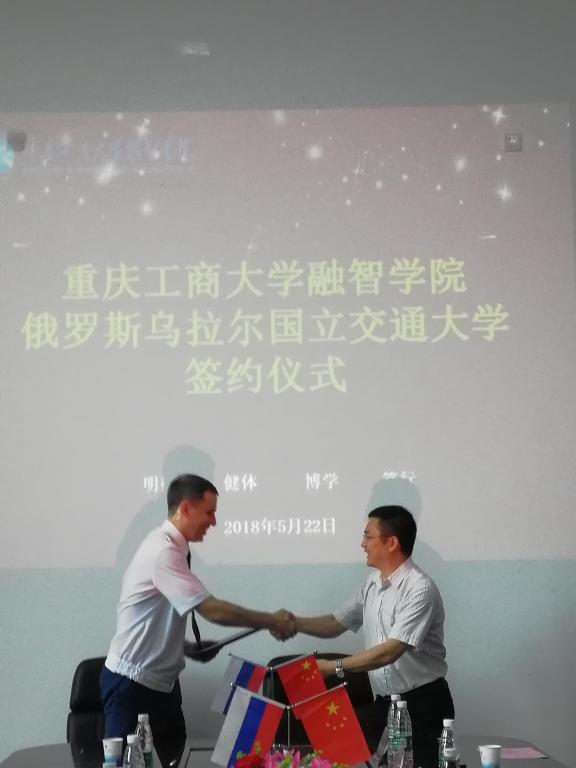 随后,我校与俄罗斯乌拉尔国立交通大学在教学楼1205A会议室进行合作洽谈。此次会议出席人员有:俄罗斯乌拉尔国立交通大学第一副校长步树耶夫·谢尔盖·瓦京诺维奇博士、外事工作副校长阿纳什金娜·娜塔莉娅·尤里耶夫娜博士、中俄学院院长乔聪博士;重庆电视台“爱心帮帮帮”栏目总制片人李勇先生;圣彼得堡中俄文化交流中心重庆办事处罗瑜先生;重庆仕路教育咨询有限公司总经理邓兴宇先生;重庆工商大学融智学院党委丁广龙书记、吴华安副校长、国际合作交流处石转转处长、商务学院张红梅院长、金融学院贺晗副院长、管理工程学院黄兰副院长;国际语言学习中心王慧主任、国际合作交流处李慧。
