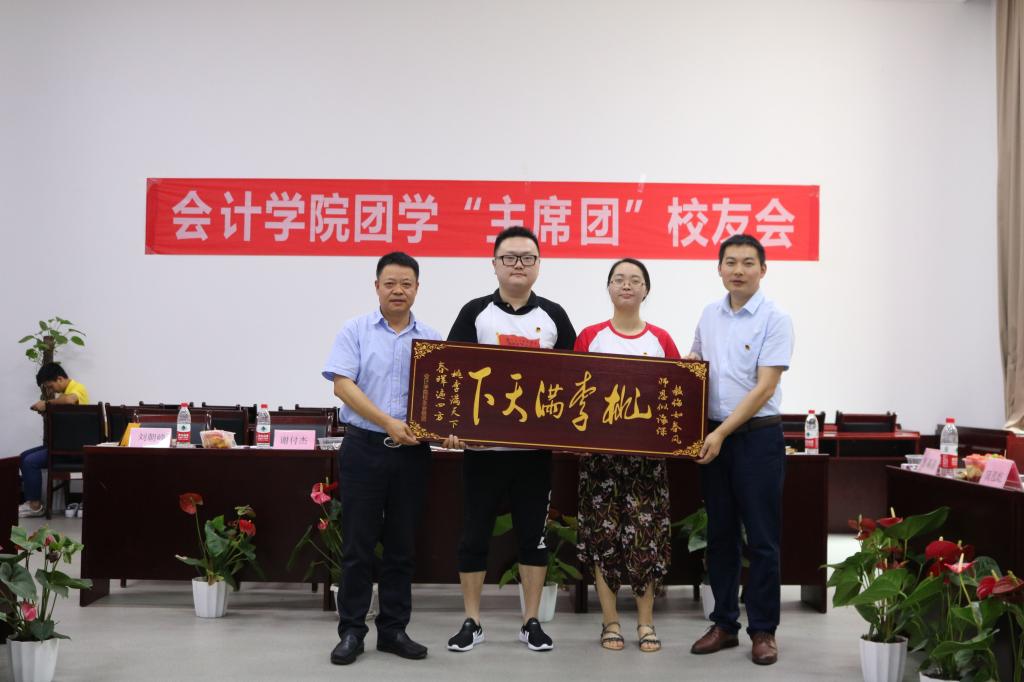 随后,现任学生会主席张昶昶就近两年会计学院团学工作进行了汇报。过去两年里,会计学院团总支学生会围绕学校中心工作,认真落实全团工作部署,进一步将学科竞赛、社会实践和校园文化生活相结合,秉承优良传统,圆满地完成了学校给予的各项工作任务,并取得了较好的成绩。到场校友在听完汇报后更是回想起了当初在团学奋斗的日子,纷纷表示大学四年最美好的回忆都在团学,在团学得到了很大的锻炼,让自己的综合能力有了很大提高,这些收获让自己在现在的工作中很是受用。会议接近尾声,校友会会长也代表全体校友向学校的辛勤栽培表示了感谢并向学校赠送了感恩礼。最后,陈龙国副书记代表学校全体师生向返校校友表示了热烈的欢迎,向大家多年来对学校事业发展给予的关心和大力支持表示了衷心的感谢!并向大家介绍了“十三五”规划以来,学校在校园建设、规模发展、层次提升等方面取得的成就。陈龙国副书记指出校友是学校的品牌与形象,是向社会展示的靓丽名片,也是学校的宝贵财富,要求各位校友借此次校友会为契机,加强与学校的联系,搭建好校友与学校,校友与校友之间交流合作的平台,同时他还热情邀请各位校友常回家看看,感受母校的变化,回忆青春岁月,畅叙师生情谊。