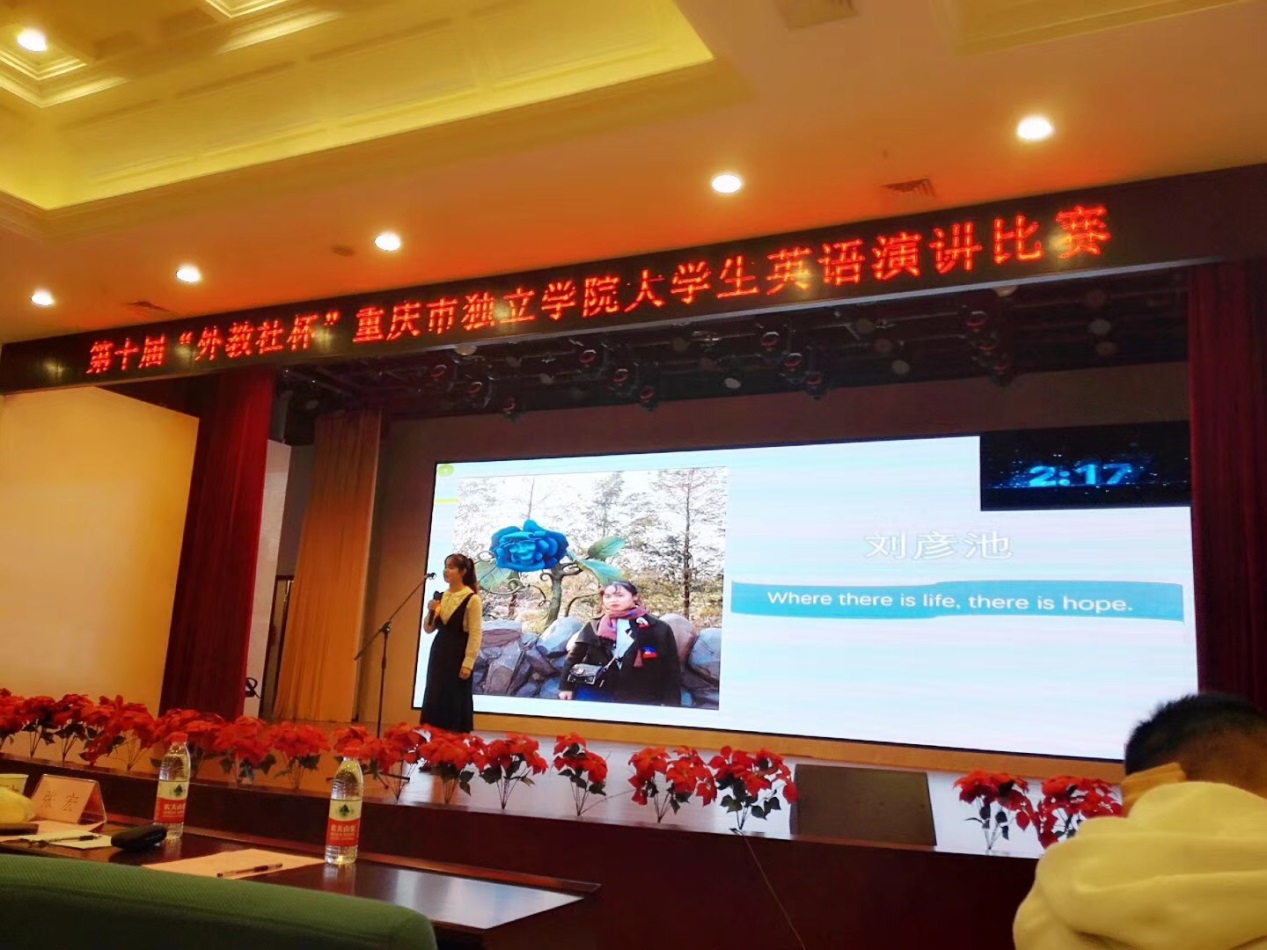 本次比赛分为命题演讲,即兴演讲与问答三个环节。重庆邮电大学外国语学院副院长彭晓蓉教授、重庆工商大学外国语学院副院长杨玉兰教授、重庆第二师范学院张泽健教授等专家应邀作为本次决赛的评委。经过初赛,复赛,决赛的激烈角逐中,共有29名选手脱颖而出。在比赛过程中,选手们在舞台上用着或幽默诙谐,或深情低沉,或慷慨激昂的语言来阐述着他们对于社会热点问题的观点,宣告着当代青年的心声。问答环节中,选手们凭借较高的英语水平,较强的临场发挥能力和应变能力,赢得了观众的阵阵掌声。我校选手张馨予、刘彦池、赵朝圣凭借扎实的英语功底和出色的现场发挥,一举包揽了大学英语组一等奖的三个名额。