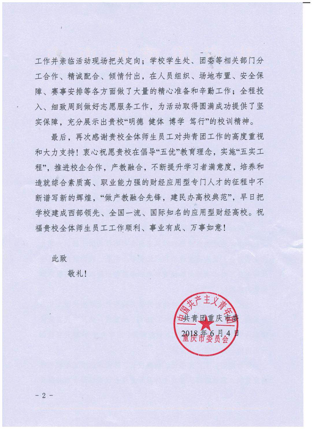 现共青团重庆市委特发来感谢信致谢,信中他们提到“活动期间,丁广龙书记、柏群校长、陈龙国副书记等校领导高度重视、靠前指挥,多次主持召开专题会议安排部署有关筹备工作并亲临活动现场把关定向‘学校学生处、团委等相关部门分工合作、精诚配合、倾情付出,在人员组织、场地布置、安全保障、赛事安排等各个方面作了大量的精心准备和辛勤工作;全程投入、细致周折做好志愿服务工作,为活动取得圆满成功提供了坚实保障,充分展示出贵校‘明德 健体 博学 笃行’的校训精神。”,并祝我校在“推进校企合作,产教融合,不断提升学习者满意度,培养和造就综合素质高、职业能力强的财经应用型专门人才的征程中不断谱写新的辉煌”。
