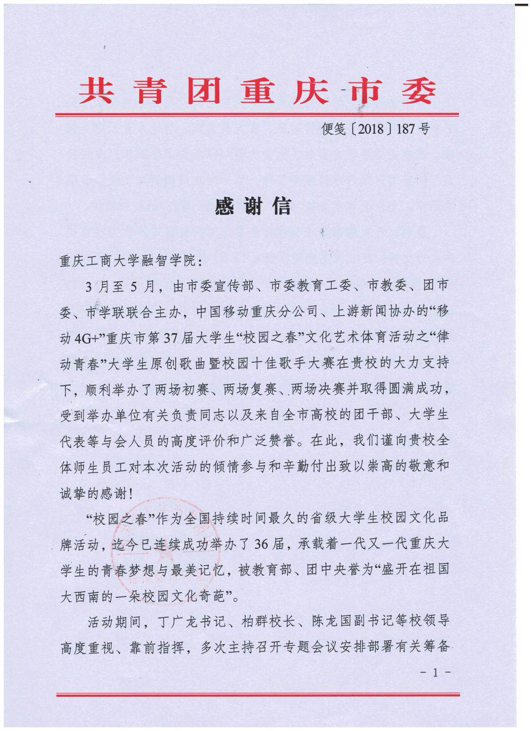 “共青团重庆市委”致我校的感谢信