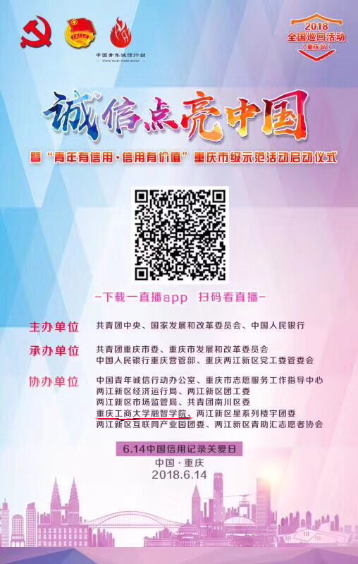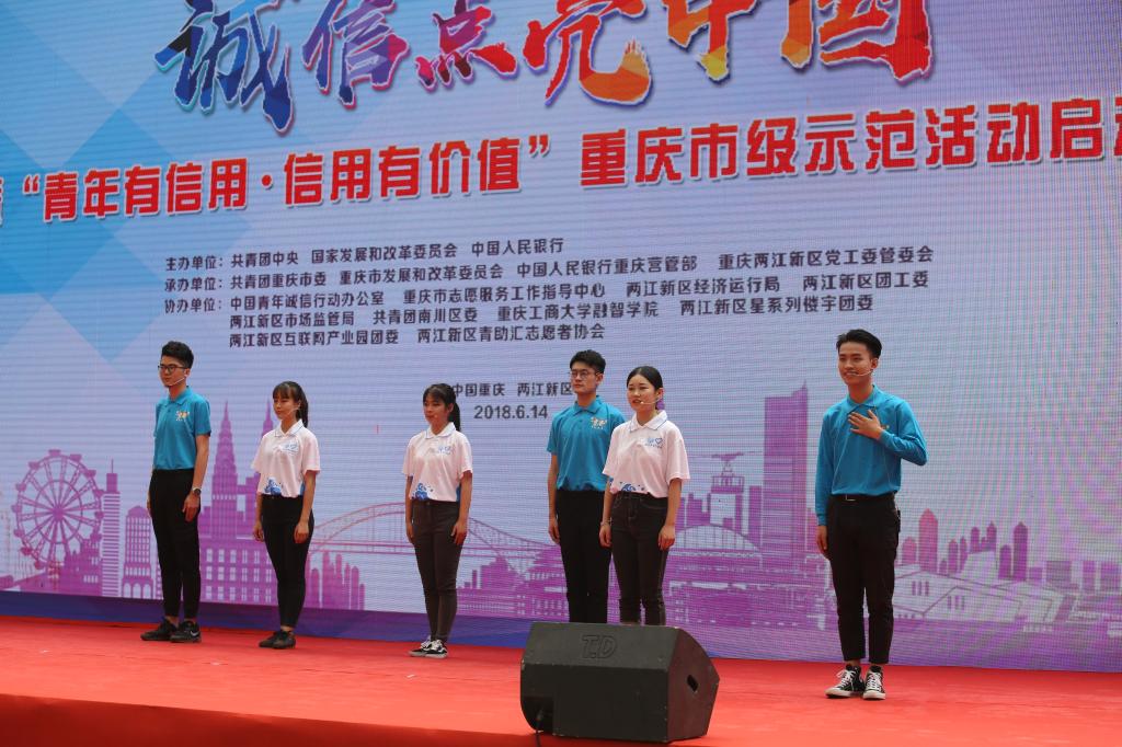 为引领广大青年诚实守信,不断提高社会信用水平,共同为“诚信点亮中国”凝聚青春力量,6月14日上午,第10个“中国信用记录关爱日”之际,“诚信点亮中国”全国巡回活动(重庆)启动仪式暨“青年有信用·信用有价值”市级示范活动,在两江新区星汇两江艺术商业中心广场隆重举行。我校作为全市青年信用体系建设试点单位参与了此次活动协办工作。