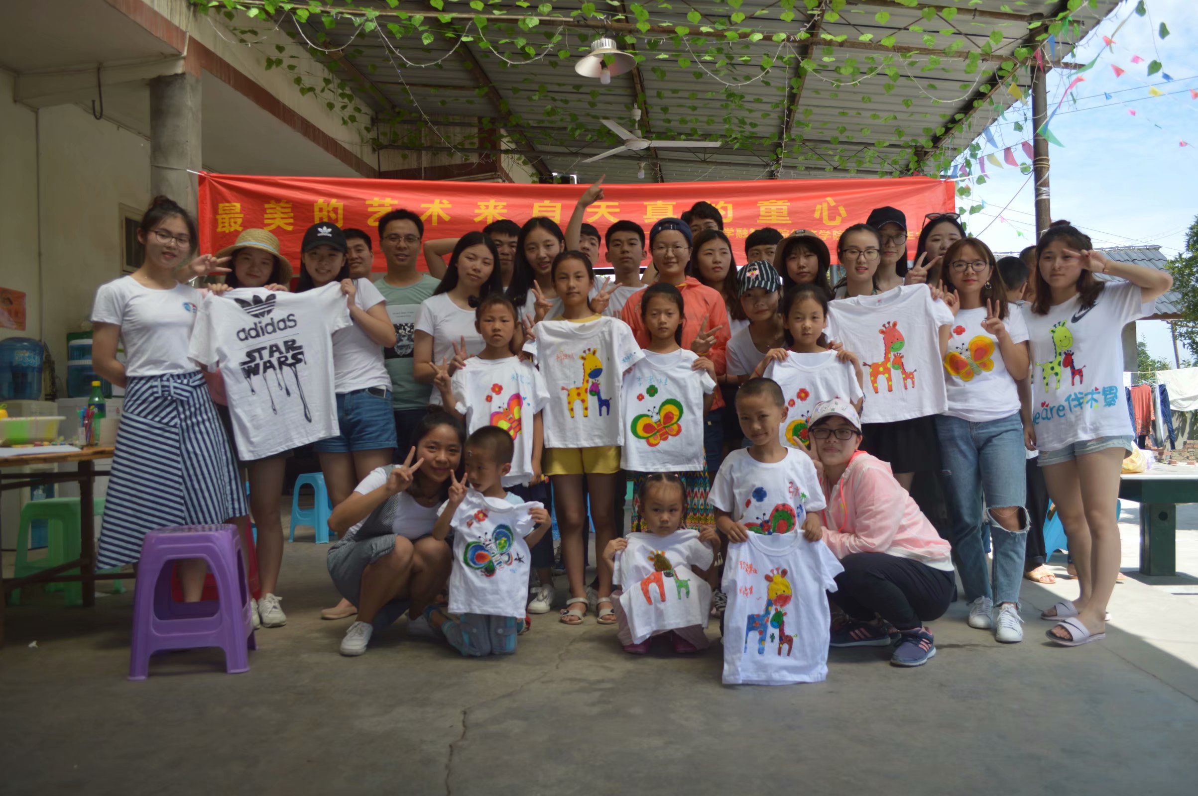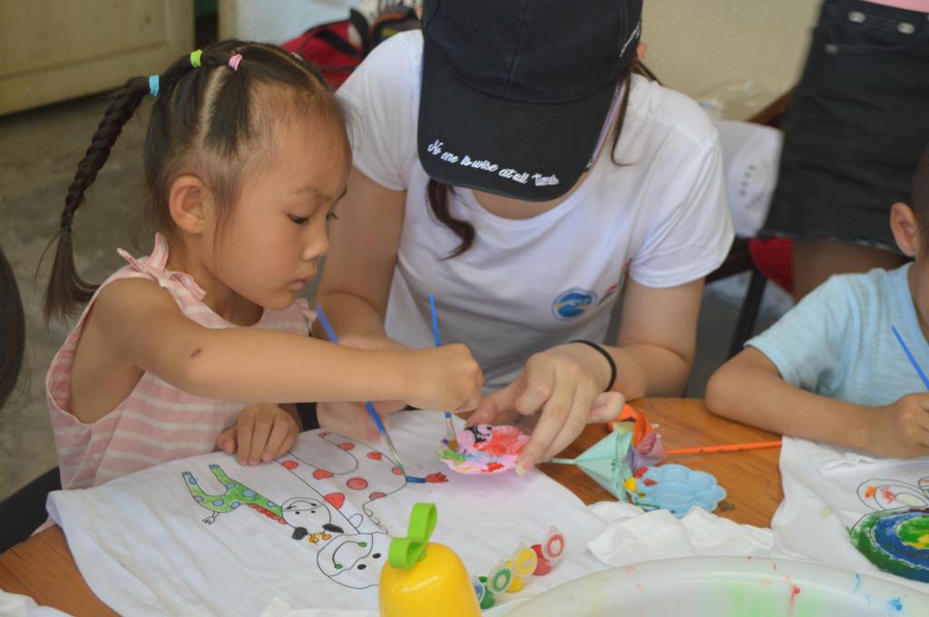 活动现场,服务团的志愿者们和小朋友们热情高涨,以两人一组的形式进行绘画以及T恤涂鸦的趣味课堂。每个小朋友在志愿者的引导下都充分发挥自己的动手能力与想象力,用稚嫩的双手画出一幅幅最纯真的图画。