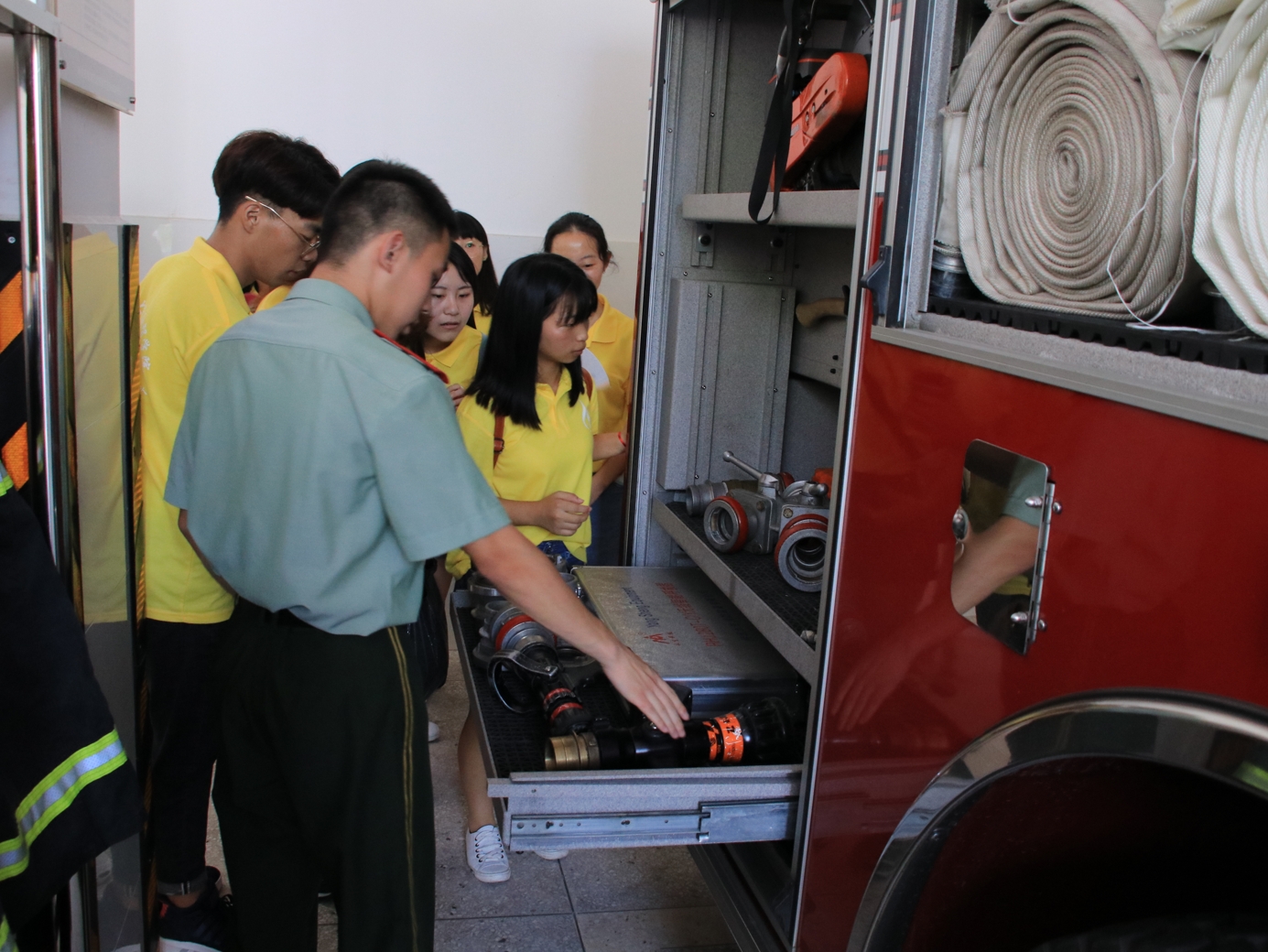 下午2:30,我们步履不停来到铜梁消防支队白龙中队。在消防队殷天时指导员的安排下,消防官兵和我们齐聚活动室进行文艺演出,消防官兵们也为我们带来了架子鼓表演及歌曲《不再犹豫》。汇演完毕,我们跟随他们的脚步,参观了荣誉室、会议室等办公区域,深入了解了白龙中队队史、官兵风采,以及他们的工作内容,我们还参观了休闲书吧、宿舍,感受到了他们在繁重紧张的工作之余,也有丰富多彩的业余生活和一丝不苟的生活态度。在宽阔的底楼区域,停放着几辆鲜艳的消防车,消防官兵们向我们一一介绍了车上的装备以及各个设施的功用。此外,他们还给我们表演了消防业务技能,同学们现场学习了如何快速穿消防服以及绳索攀爬技巧,亲身体验到了危急时刻消防人员业务技能过硬是多么重要,消防工作直接关系到人民生命财产安全,关系到民生福祉和社会稳定,他们所肩负的责任和使命重大。