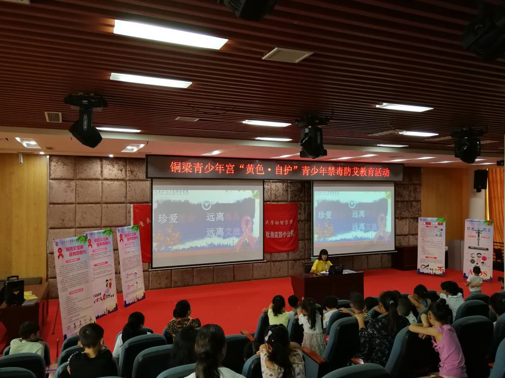 在青少年中开展识毒、防毒、拒毒以及防艾知识教育是我们本次“三下乡”实践活动的重要任务之一。上午9:00,我们来到了铜梁青少年宫,在这里开展“禁毒防艾”系列宣传活动。首先,我们在多功能报告厅为前来参加活动的孩子和家长们进行了文艺汇演,一支热情的舞蹈《Good Time》让现场沸腾,歌曲《最初的梦想》更是激动人心,小品《心灵的创伤》发人深省。恰逢兄弟院校重庆师范大学涉外商贸学院外国语学院的暑期“三下乡”小分队也在此开展活动,我们合作表演了一首慷慨奋进的诗朗诵。汇演结束后,我们举行了以“珍爱生命,远离毒品,远离艾滋病”为主题的展讲,详细介绍了毒品的品种、危害,以及如何预防艾滋病等相关知识。展讲过程中我们还穿插了有奖竞猜环节,现场的小朋友们争先恐后回答问题,这种集知识性与趣味性于一体的活动形式深受小朋友们喜爱。