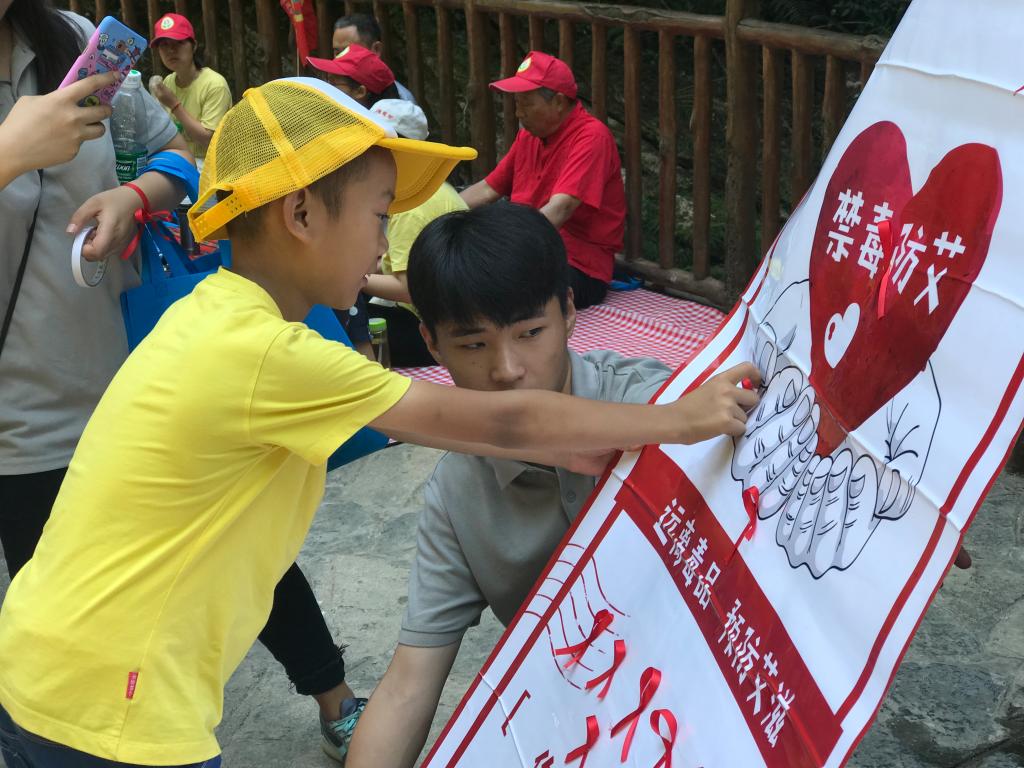 “人之初,性本善;性相近,习相远。”志愿者们与正在武隆龙水峡地缝进行夏令营的中小学生一同朗诵三字经,对中小学生进行传统文化教育,加深了他们对于传统文化的认识,在一定程度上推动了他们继承与发展传统文化。志愿者们在与中小学生互动的过程中,将准备好的红丝带发放给夏令营的中小学生及其他游客,他们秩序井然地将红丝带绑在手上,贴在胸前,还有部分游客将红丝带贴在了关爱教育和禁毒防艾的展板上。