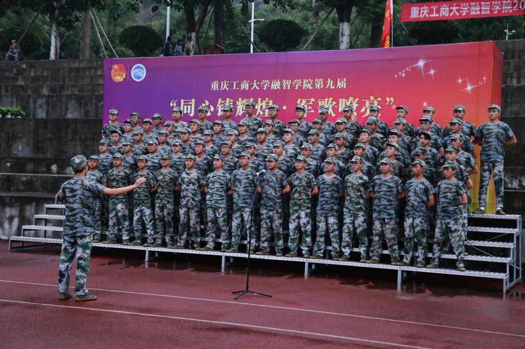 各连在操场上使出浑身解数将自己准备的歌曲展现出来,豪迈唱出军营生活的无限风采,严明的纪律、严整的军容展现了这十几天军训来的丰硕成果。30个连参加比赛只有个10连进入决赛,在决赛场上有女生连唱的«女兵谣»体现出巾帼不让须眉的英姿,有男生连«歌唱祖国»的雄心壮志,各展身手,豆大的雨水打在身上也不能浇灭同学们的热情。同心铸辉煌,以诗的语言配以优美旋律来表达融智情感,是融智精神文化教育与传承的方式之一。