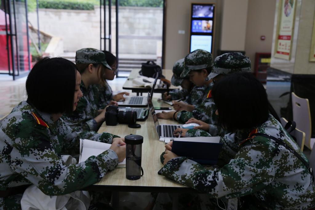 (通讯员梅赵紫 洪梳桓)军训时一个特殊的群体,他们十二个人,和其他参训学生不一样,他们每天都会带上两件东西,相机和纸笔,他们被称为记者连,另外,还有一个名字——军训记者团。