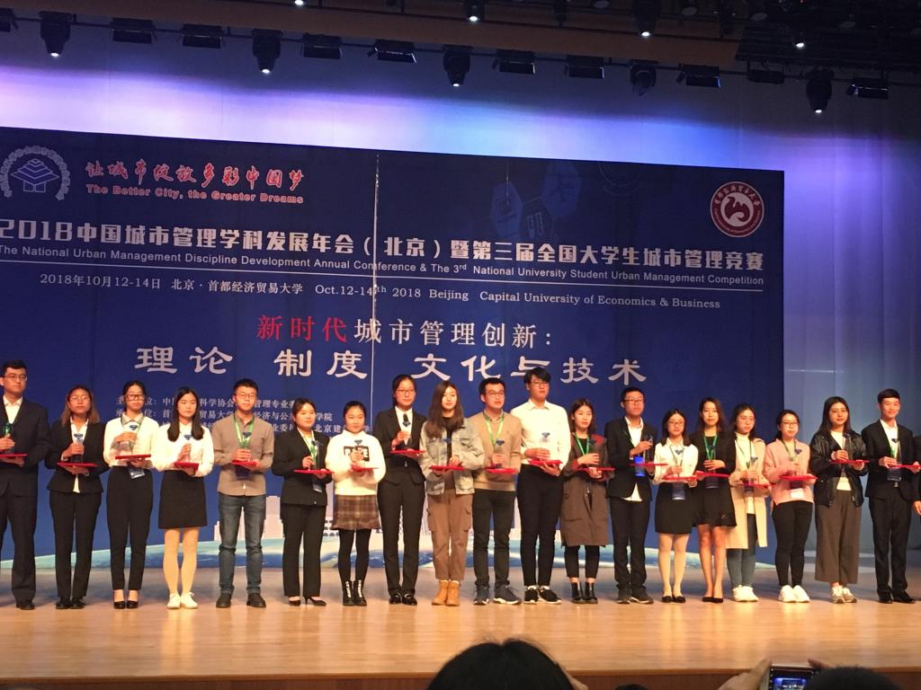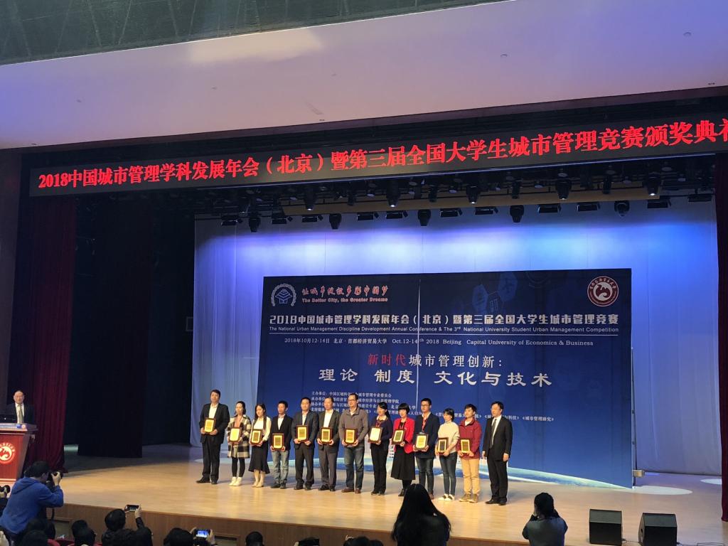 20181012日,第三届全国大学生城市管理竞赛在北京首都经济贸易大学顺利举行,有中国区域科学协会城市管理专业指导委员会主办,来自全国155所高校约300多个参赛小组进行了角逐。我校信息工程学院院长周启刚教授、信息工程学院院长助理兼城市管理专业教研室主任李辉老师、城市管理教研室孙英老师和刘小飞老师共同带领我校城市管理、土地资源管理专业共5个小组15名学生赴北京参加了本次竞赛决赛,我校收获颇丰,共斩获2个一等奖、2个二等奖、1个三等奖以及优秀组织奖的优异成绩。