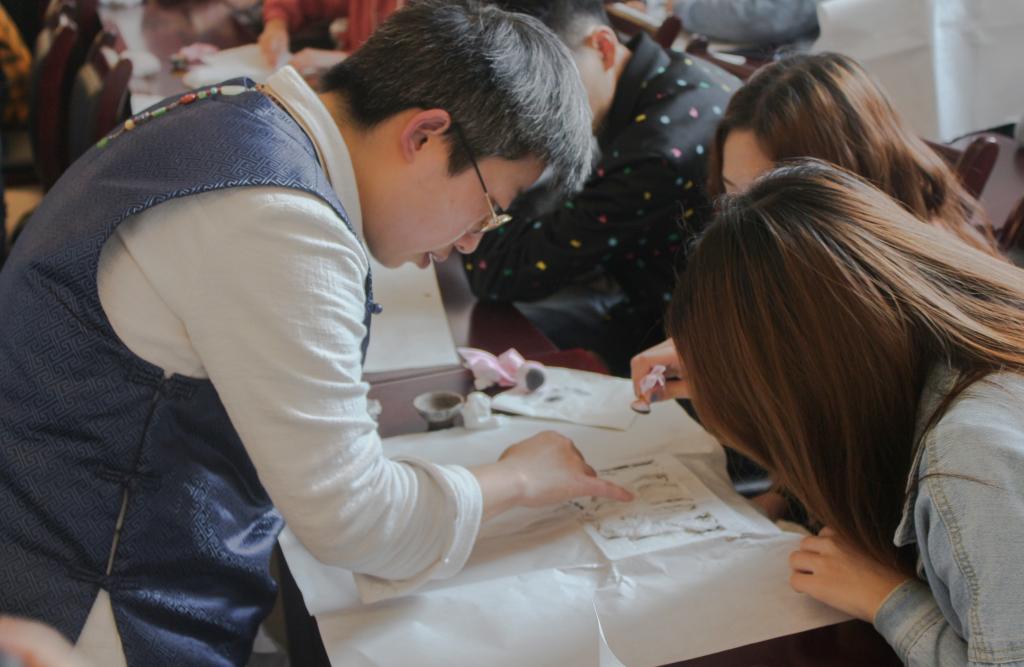 民间拓片艺术传人李荆老师首先从拓片艺术的历史、流派和社会价值等三个方面做了相关知识的介绍,她提到拓片是我国一项古老的传统技艺,是使用宣纸和墨汁,将碑文石刻、青铜器等文物的形状及其上面的文字和图案拓下来的纸片。然后,李老师用丰富的图片向同学们展示了甲骨文拓片、铜器拓片等大量文物拓片作品,拓片上精美的图案深深地吸引了在场的所有同学。图片讲解结束后,李老师为大家示范了制作拓片的过程,说明了每道程序的注意事项,揭开了拓片艺术美丽而又神秘的面纱,充分地展现了传统民间技艺的独特魅力。经过认真学习和共同合作,同学们也亲手尝试制作了自己喜爱的拓片作品。在拓片制作体验过程中,同学们互相帮助,互相鼓励,主动展示自己的制作成果,现场气氛十分活跃。活动最后,同学们捧着各自的拓片作品和李老师合影留恋。