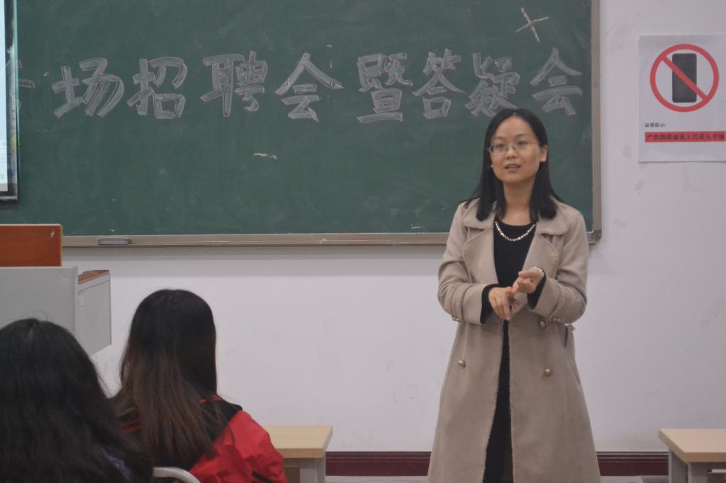 为了更好的解决大学生就业难题,拓宽毕业生就业渠道,提高毕业生的就业率。11117点,重庆工商大学融智学院在教学楼1408教室开展财富管理学院专场招聘会暨答疑会。出席本次专场招聘会的嘉宾有:财富管理学院副院长赵娜,学团办副主任宋钰静,教学秘书罗怡以及主讲师王毅教授。