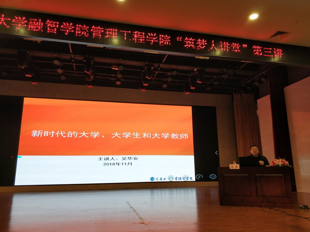 为更加深入的学习20186月在成都召开的本科教育工作会议和20189月在北京召开的全国教育大会的会议精神,全面贯彻落实习总书记提出的教育方针,同时增强管工师生对于新时代的师生身份的认识,管理工程学院 “筑梦大讲堂”第三讲——新时代的大学、大学生和大学教师于116日中午1230分在学术报告厅举行,本次讲座由融智学院副校长吴华安博士作为主讲人,管理工程学院全体师生参加此次讲座。