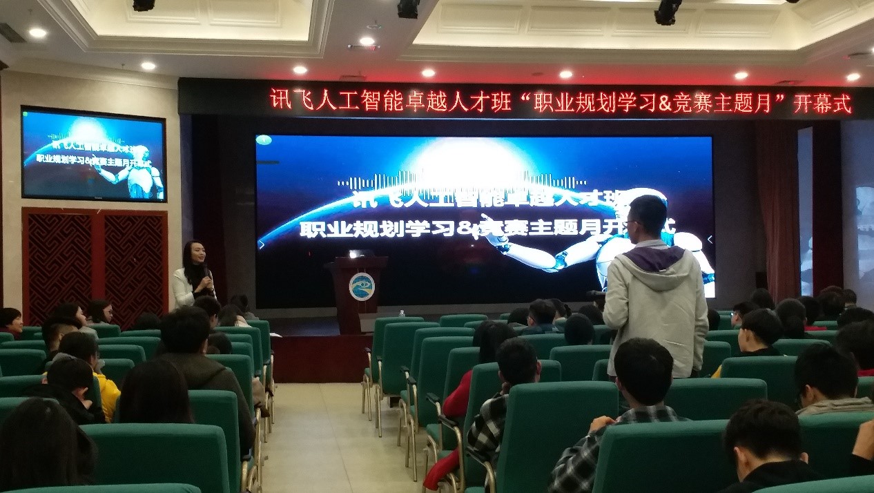 2018年11月7日,我院在学术报告厅开展了“讯飞人工智能卓越人才班“职业规划学习&竞赛主题月”开幕式”,本次活动主讲人为企业执行总经理陈方舟博士。出席本次活动的学校嘉宾有:重庆工商大学融智学院党委副书记陈龙国副书记,信息工程学院院长助理李辉老师,空间信息与数字技术专业负责人何昌华老师,以及全校各个学院辅导员老师。企业嘉宾有:“讯飞人工智能学院”执行院长田荣阳老师,科大讯飞股份有限公司市场经理陈超。