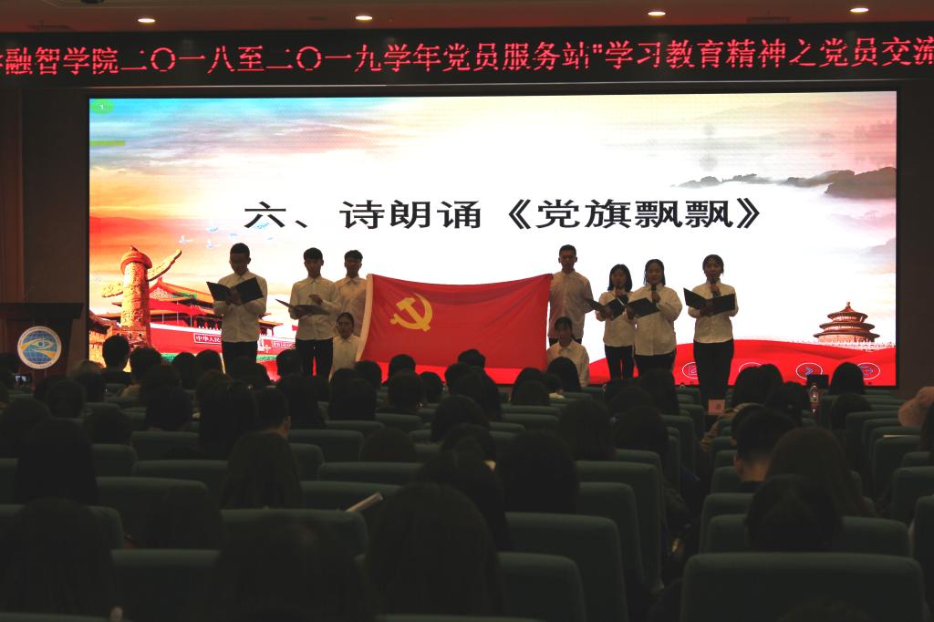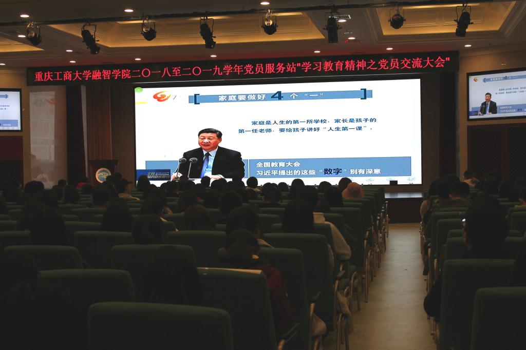 重庆工商大学融智学院2018-2019学年第一学期党员服务站学习“全国教育大会精神”党员交流大会”于11月7日中午12:20在教学楼学术报告厅盛大召开,本次大会,邀请到的金融学院党总支副书记陈萍老师、管理工程系学生党支部组织委员姜采妮老师、财富管理学院学生党支部书记宋钰静老师和党群工作部钟定华老师参加此次活动,各二级学院的学生党员,积极分子共同参与。